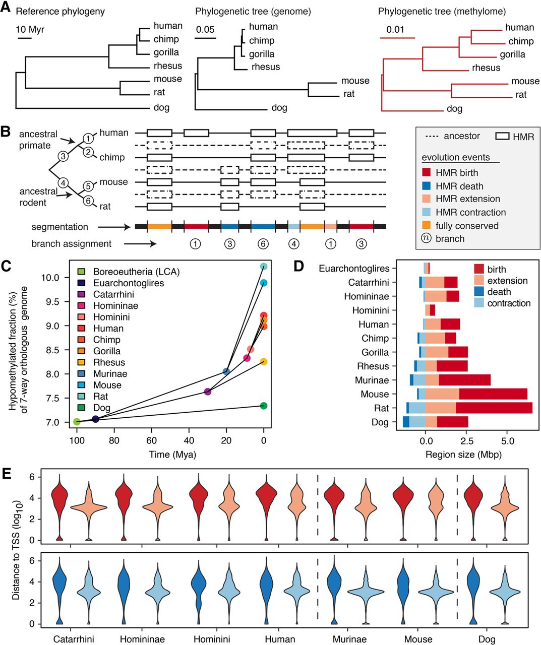 Methylation loss exceeds methylation gain during evolution. (A) Phylogenetic tree representing consensus divergence time (Hedges et al. 2015) genome evolution and sperm methylome evolution. Unit branch length represents 1 million yr, one substitution/site, and one methylation state change/CpG site, respectively. (B) Schematic segmentation of the orthologous genome according to the history of methylation evolution and annotation of methylation mutation events. (C) Fraction of orthologous genome hypomethylated in extant and ancestral species, estimated by the interdependent-site phylo-epigenetic model. (D) Total size of different types of methylation evolution events on individual branches. (E) The distribution of distances from methylome evolution events to closest TSS in the seven-way orthologous genome. The color legend is as shown in D.