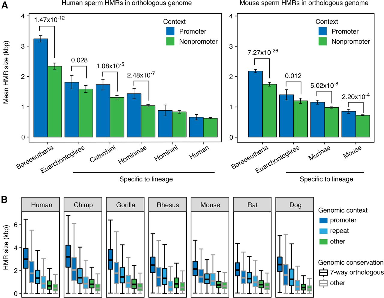 Older and more conserved sperm HMRs are wider. (A) Mean sizes of promoter and nonpromoter HMRs in the seven-way orthologous genome of human and mouse sperm, grouped by estimated HMR emergence time in mammalian evolution. Error bars indicate standard errors of the mean. Significant Wilcoxon rank-sum test P-values are shown. The Boreoeutheria group contains HMRs conserved in all seven species, representing HMRs formed before and during the speciation of Boreoeutheria. Other groups represent HMRs formed during the speciation of respective lineages. (B) Distribution of HMR sizes in native genome assemblies, grouped by genomic context and conservation level.