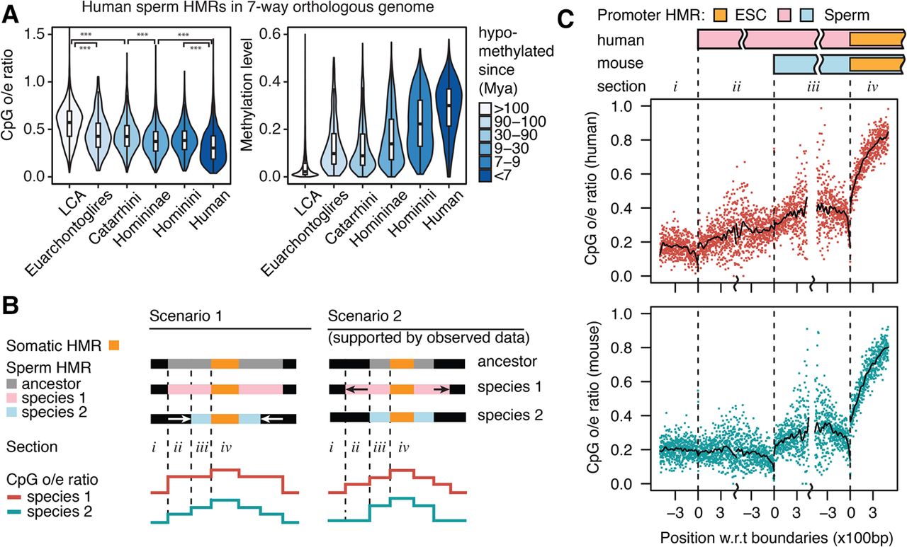 Sequence signatures driven by sperm methylome evolution. (A) CpG enrichment (observed/expected ratio of CpG occurrences) and regional average DNA methylation level in human HMRs in seven-way orthologous genome grouped by estimated hypomethylation age. (B) Two opposite scenarios explaining the evolution path to different promoter HMR sizes in two extant species and the expected CpG enrichment schematic profile in the extant species as a result of methylation-induced CpG decay. (C) Human and mouse CpG enrichment profile at hypomethylated orthologous gene promoters, where human sperm HMRs are wider than mouse. Profiles show CpG enrichment in 2-bp windows by distance to indicated HMR boundaries. Smoothed lines were generated with local polynomial regression fitting (LOESS).