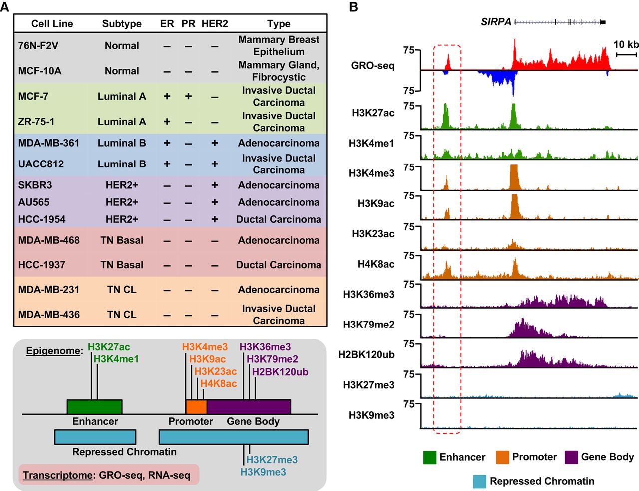 Transcriptional and epigenomic profiling identifies putative enhancers across the breast cancer genome. (A, top) Features of cell lines representing five distinct molecular subtypes of breast cancer, which were used in this study, including ER, PR, and HER2 status. (CL) Claudin-low. (Bottom) Depiction of the transcriptional (GRO-seq and RNA-seq) and epigenomic (ChIP-seq) profiles generated for each cell line. (B) Genome browser views of GRO-seq and histone modification ChIP-seq data from a normal breast epithelial cell line (76N-F2V) showing the features of a typical bidirectionally transcribed enhancer (red box with dashed line) and its nearest neighboring gene (SIRPA). Key features include transcription (red/blue), as well as histone modifications typically enriched at enhancers (green), promoters (brown), gene bodies (purple), and repressed chromatin (turquoise).