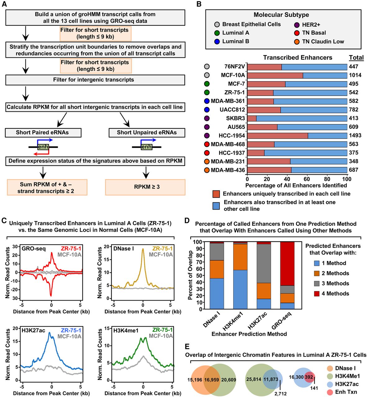 Unbiased, genome-wide prediction of active enhancers using GRO-seq data. (A) Overview of the computational pipeline used for the genome-wide annotation of enhancer transcripts (eRNAs) and prediction of active enhancers using GRO-seq data. (B) Catalog of all predicted active enhancers in the breast cancer cell lines listed in Figure 1A defined by enhancer transcription using the pipeline shown in A. Red indicates cell-type–specific enhancers, and blue represents enhancers transcribed in at least one other cell line. The colored circles indicate the molecular subtype of each cell line. (C) Metaplot analyses showing correlations among enhancer transcription, DNase I hypersensitivity, H3K27ac enrichment, and H3K4me1 enrichment for the uniquely transcribed enhancers identified in ZR-75-1 cells in B. Metaplots for the same genomic loci in MCF-10A cells are shown for comparison (gray lines). (D) Stacked bar chart comparing enhancer prediction methods in ZR-75-1 cells. Intergenic enhancers were called using prediction methods based on four different enhancer features: enhancer transcription (using GRO-seq and the pipeline shown in A), DNase I hypersensitivity, H3K4me1 enrichment, or H3K27ac enrichment. The percentage of called enhancers from each prediction method overlapping enhancers called using one or more of the other methods is shown. (E) Venn diagrams showing the number of enhancers called in ZR-75-1 cells and the overlap of enhancers called using DNase I and H3K4me1 (left), H3K4me1 and H3K27ac (middle), and H3K27ac and enhancer transcription (right).