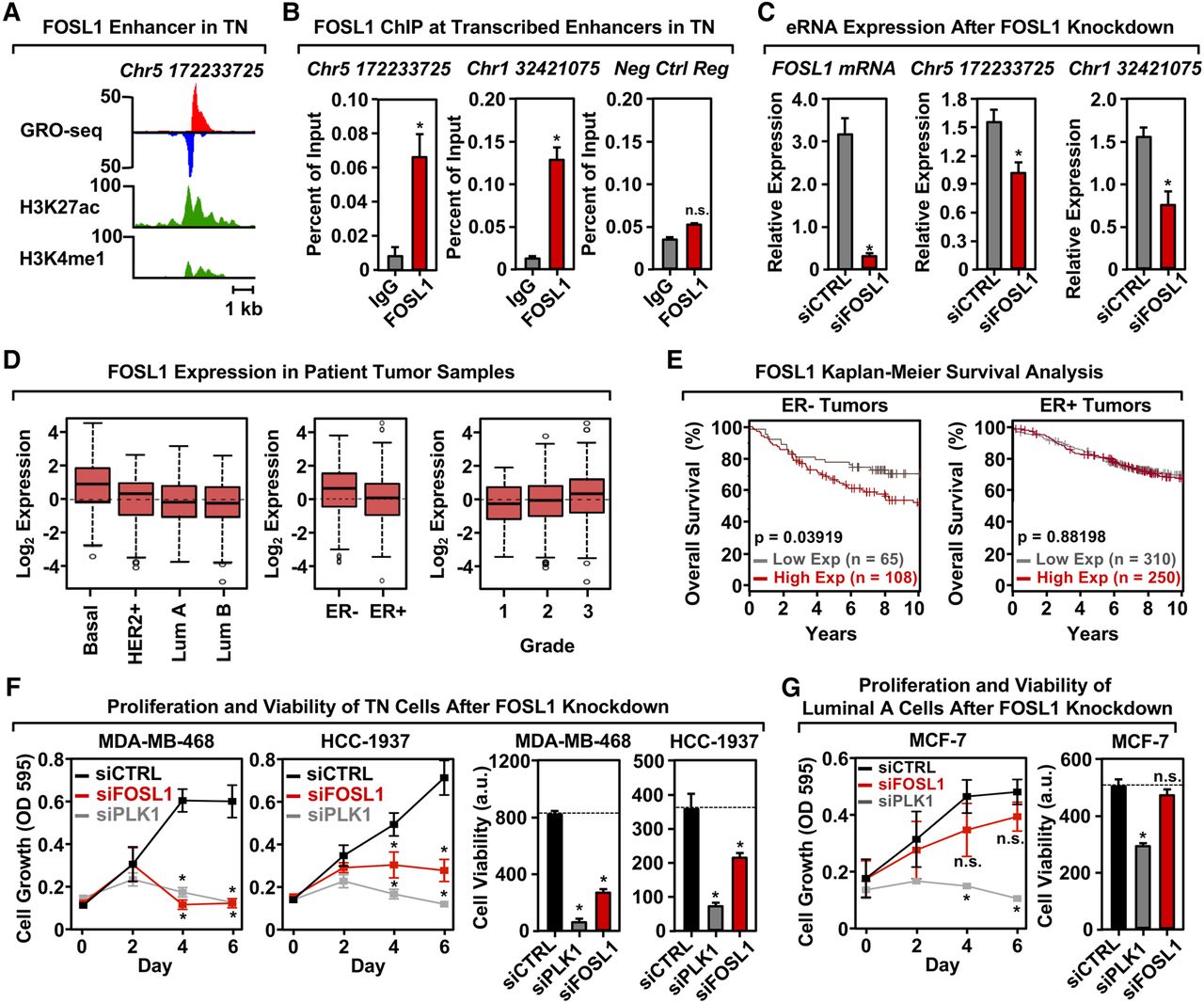 FOSL1 is enriched at transcribed enhancers in TN cells, regulates cell proliferation, and correlates with breast cancer patient outcomes. (A) Genome browser views of a transcribed enhancer predicted to be bound by FOSL1 in TN cells (GRO-seq; H3K27ac and H3K4me1). The data shown are from TN basal breast cancer cells (HCC-1937). (B) ChIP-qPCR for FOSL1 at two transcribed enhancers predicted to be bound by FOSL1, shown in a TN basal cell line (HCC-1937). The enhancers are designated by their genomic coordinates. Genome browser shots for the enhancer found on Chr 5 are shown in A. Each bar represents the mean + SEM, n = 3. Asterisks indicate significant differences from the corresponding control (Student's t-test, P-value < 0.05). (C) siRNA-mediated knockdown of FOSL1 in a TN basal cell line (HCC-1937) decreases the transcription of cognate enhancers as determined by RT-qPCR. The enhancers are designated by their genomic coordinates. Each bar represents the mean + SEM, n = 3. Asterisks indicate significant differences from the corresponding control (Student's t-test, P-value < 0.05). (D) Box plots of FOSL1 mRNA expression levels in patient tumor samples confirm enrichment of FOSL1 in Basal-like and in ER-negative (ER-) breast tumor samples, as predicted by the TFSEE analysis in breast cancer cell lines. Observed differences are significant as determined by an ANOVA comparison of the means (P-value < 0.00001). (E) FOSL1 mRNA expression is predictive of clinical outcomes in ER-negative (ER-) breast tumor patients. Kaplan-Meier survival analyses of patients expressing high levels of FOSL1 mRNA (maroon line) exhibit a poorer outcome compared to patients expressing low levels of FOSL1 mRNA (gray line). The breast cancer outcome-linked gene expression data were accessed and graphed using the Gene Expression-Based Outcome for Breast Cancer Online (GOBO) tool (Ringnér et al. 2011). (F) siRNA-mediated knockdown of FOSL1 in two TN cell lines (MDA-MB-468 and HCC-1937) causes decreased proliferation and viability, as observed in proliferation assays (left) and cell viability assays (right). siRNA-mediated knockdown of Polo-like Kinase 1 (PLK1) serves as a positive control. Each point or bar represents the mean + SEM, n = 3. Asterisks indicate significant differences from the corresponding control (Student's t-test, P-value < 0.05). (G) siRNA-mediated knockdown of FOSL1 in Luminal A cell line (MCF-7) shows no significant effects on proliferation or viability compared to TN cells. siRNA-mediated knockdown of Polo-like Kinase 1 (PLK1) serves as a positive control. Each bar represents the mean + SEM, n = 3. The asterisks indicate significant differences from the corresponding control (Student's t-test, P-value < 0.05). (n.s.) not significant (Student's t-test, P-value > 0.05).