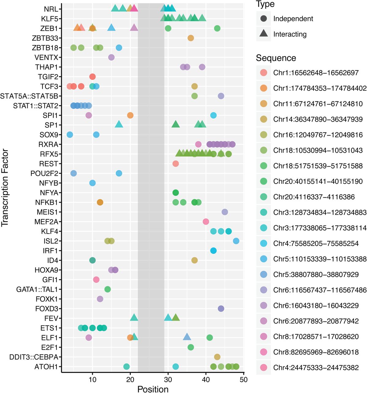 Identities and locations of potential independent and interacting TFs: (x-axis) position along regulatory sequence; (y-axis) transcription factor identity. Each row represents one TF, and points depict interacting (▴) or independent (•) substitutions under the TF motif at the indicated position on the x-axis. Colors represent the regulatory sequence in which the TF was present. When multiple TFs with similar motifs matched a single substitution pattern, one representative TF was chosen.