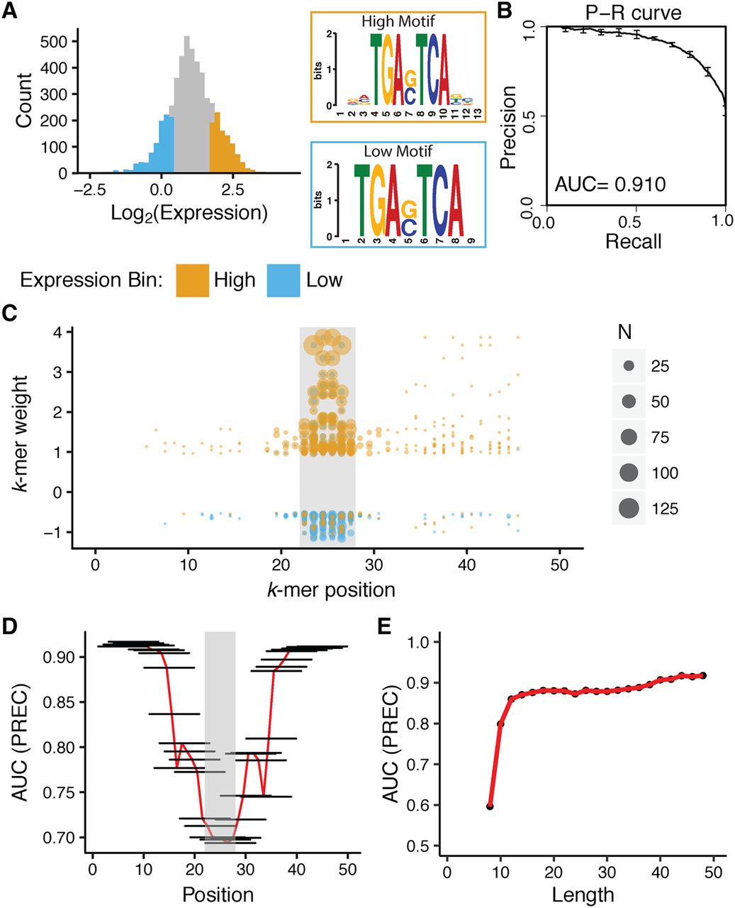 K-mers that distinguish HIGH and LOW DHS are enriched within 10 bp of the AP-1 core motif. (A) Expression distribution for 5000 sequences in DHS regions containing AP-1 sites. (x-axis) Log2(RNA/DNA) counts for barcodes representing particular cis-regulatory sequences (left). The top 1000 sequences are annotated as HIGH (orange), and the bottom 1000 sequences are annotated as LOW (blue). Motifs derived from HIGH and LOW sequences using MEME motif discovery tools (right). (B) gkm-SVM distinguishes between HIGH and LOW sequences within DHS. Precision-recall curve for a 10-mer gkm-SVM model trained on HIGH and LOW sequences (AUC = 0.91). Error bars show standard error from fivefold cross-validation. (C) K-mers that distinguish HIGH and LOW sequences overlap the AP-1 binding site. (x-axis) Position of the center of the k-mer along regulatory element in bp; (gray box) position of the AP-1 core motif; (y-axis) k-mer weight from gkm-SVM in B. Each point is an individual k-mer, and the size of the point denotes the number of sequences containing the k-mer. The color of the point indicates whether the k-mer was found in HIGH (orange) or LOW (blue) sequence. The top 400 k-mers, 200 with positive weights and 200 with negative weights are shown. (D) In silico deletion experiment also highlights that most informative k-mers overlap with the AP-1 core motif. A 10-bp region of every sequence was masked (horizontal black lines), and a 10-mer gkm-SVM model was refit. The x-axis shows the position of the masked segment along regulatory elements, and the y-axis shows the area under precision-recall curve from the resulting model. The gray box depicts the position of the AP-1 core motif, and the red line connecting the centers of the black bars highlights the trend of AUC values across the sequence. (E) Specification of HIGH and LOW groups lies within the central 12 bps. Sequences were shortened by removing one base from both ends and a 6-mer gkm-SVM model was refit: (x-axis) length of the shortened sequence; (y-axis) area under precision-recall curve. The red line connecting the centers the points highlights the trend of AUC values across the sequence.