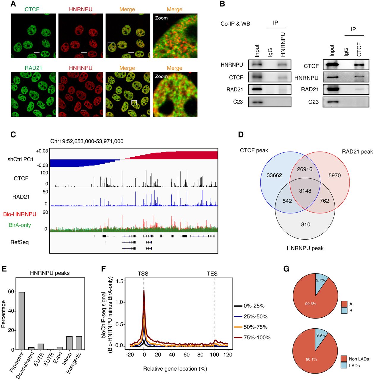 HNRNPU associates with CTCF and RAD21. (A) Immunofluorescent staining displays partial colocalization of HNRNPU (red) and CTCF or RAD21 (green) in AML12 cells. Scale bar, 10 µm. (B) Endogenous co-immunoprecipitation with HNRNPU (left) or CTCF (right) antibodies, and blots with indicated antibodies. (C) ChIP-seq tracks of CTCF and RAD21; bioChIP-seq tracks of HNRNPU and BirA only (negative control) on a 1.3-Mb region on Chromosome 19. (D) Venn diagram showing overlaps between peaks of CTCF, RAD21, and HNRNPU. (E) Distribution of HNRNPU peaks relative to genes. (F) Average profiles of HNRNPU bioChIP-seq signal of genes at different expression levels (100% denotes the highest expression). (G) Distribution of HNRNPU peaks relative to compartments and LADs.