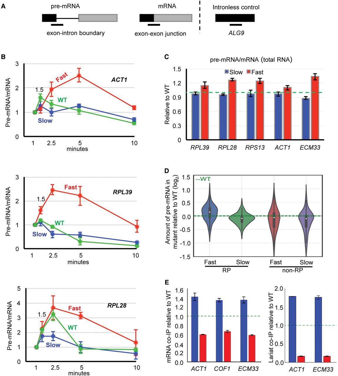 Fast elongation reduces and slow elongation enhances cotranscriptional splicing. (A) Diagram showing the location of RT-qPCR amplicons (lines below) for measuring pre-mRNA (exon–intron boundary at the 5′SS) and mRNA (exon–exon junction) levels. Black and gray boxes represent exons of intron-containing transcript or coding sequence of intron-less transcript (ALG9). (B) RT-qPCR results showing pre-mRNA/mRNA ratio for ACT1, RPL39, and RPL28 in fast (red), slow (blue), and WT (green) strains. To correct for amount of input RNA, values for pre-mRNA and mRNA were separately normalized to an intron-less transcript (ALG9) in the same sample. 4tU labeling was performed for 1, 1.5, 2.5, 5, and 10 min (x-axis), with all values plotted relative to the 1-min value. (C) Pre-mRNA/mRNA ratio of steady-state RNA for fast and slow mutants relative to WT (green dotted line). Error bars, at least three biological replicates. (D) Amount of pre-mRNA in the fast and the slow mutant relative to WT for RP and non-RP transcripts, measured by DICEseq (Huang and Sanguinetti 2016) from RNA sequencing data. (E) Fold enrichment of mRNA (left) and lariat-intron (right) association with RNAPII, in slow (blue) or fast (red) mutants relative to WT (green dotted line), measured by RT-qPCR. To correct for differences in the amount of RNA pull down, values for mRNA and lariat were separately normalized to RT-qPCR values for an intron-less transcript (ALG9). Error bars, three biological replicates.