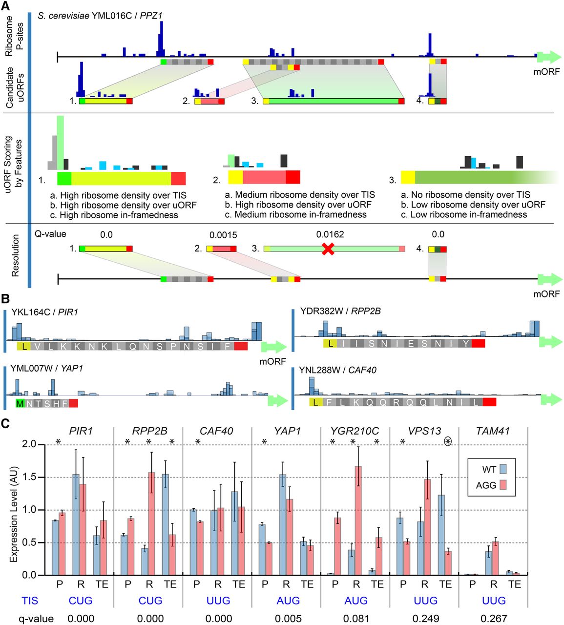 uORF identification using uORF-seqr. (A) uORF-seqr relies on genome annotation, nucleotide sequence, and ribosome profiling and RNA-seq data. PPZ1 (YML016C) is shown as an example. Candidate uORFs (containing potential start and stop codons) are scored for eighteen features (Supplemental Methods) related to Ribo-seq data (P-sites) and uORF position within transcript leaders. A linear regression is used to score each uORF according to the weighted value of these features (Methods), removing candidates that do not score significantly better than null models (Resolution). For overlapping or nested uORFs (e.g., uORFs 2 and 3), the highest scoring candidate uORF is retained. (B) P-site fraction data around four predicted uORFs. Although the Lysine codon is shown, translation is expected to initiate with methionine at NCC codons. (C) Wild-type (AUG or NCC) and AGG start codon mutants were tested for protein (P) and mRNA (R) levels using a dual fluorescence reporter and qPCR, respectively, in triplicate. Bar graphs show the mean and standard error. Estimated translation efficiencies (TE = P/R) were also compared. Significant differences: (*) t-test P < 0.05; (circled asterisk) P = 0.0549.