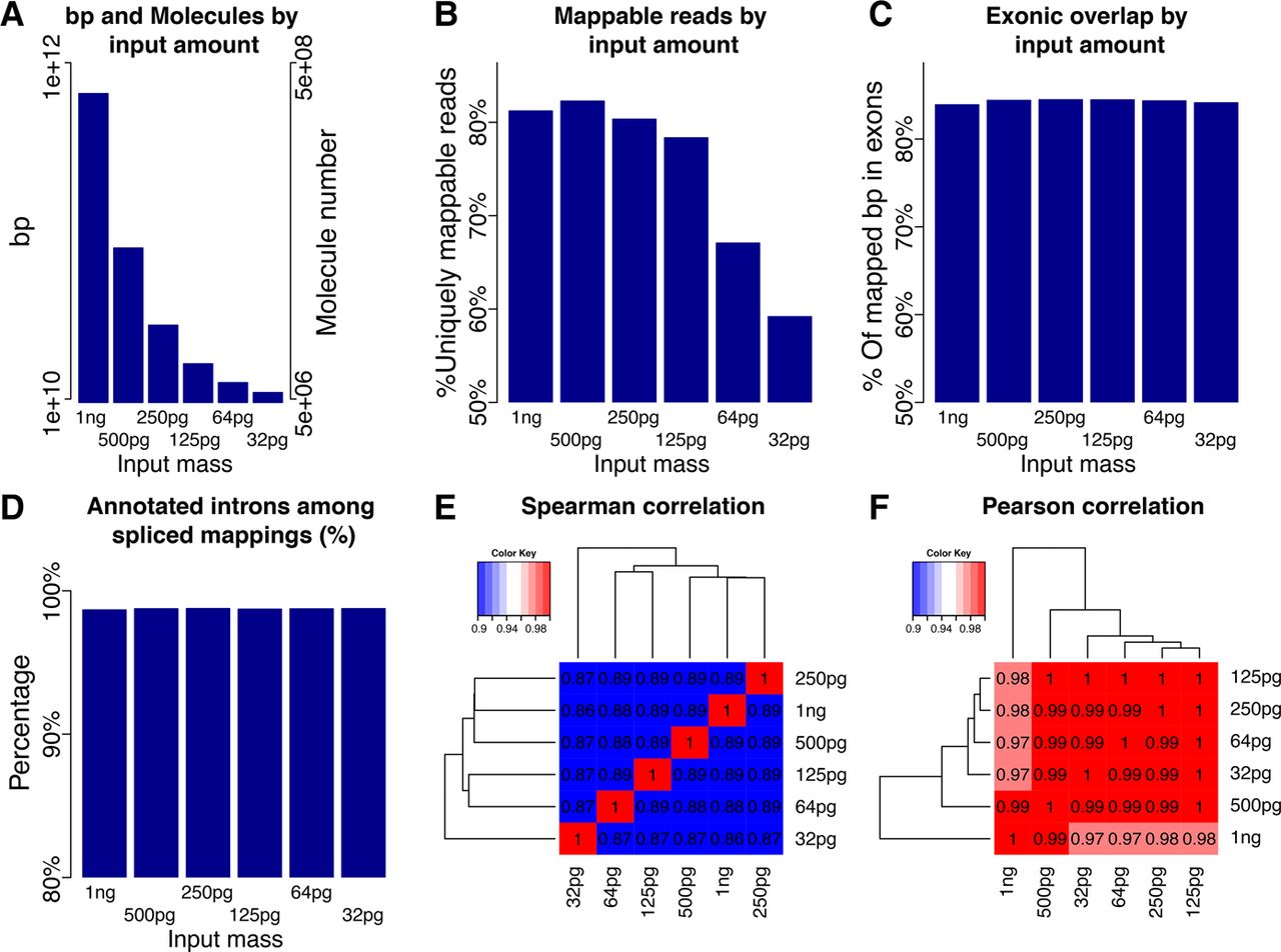 Exploration of low input capacities using shallow sequencing of a MiSeq. (A) Number of molecules and bases for different input amounts. (B) Percentage of reads that were uniquely mappable for all input amounts. (C) Percentage of mapped bases that fall onto annotated GENCODE exons for all input amounts. (D) Percentage of annotated introns among all spliced mappings for all input amounts. (E) Heat map of pairwise Spearman correlations of FPKMs for all input amounts. (F) Heat map of pairwise Pearson correlations of FPKMs for all input amounts.