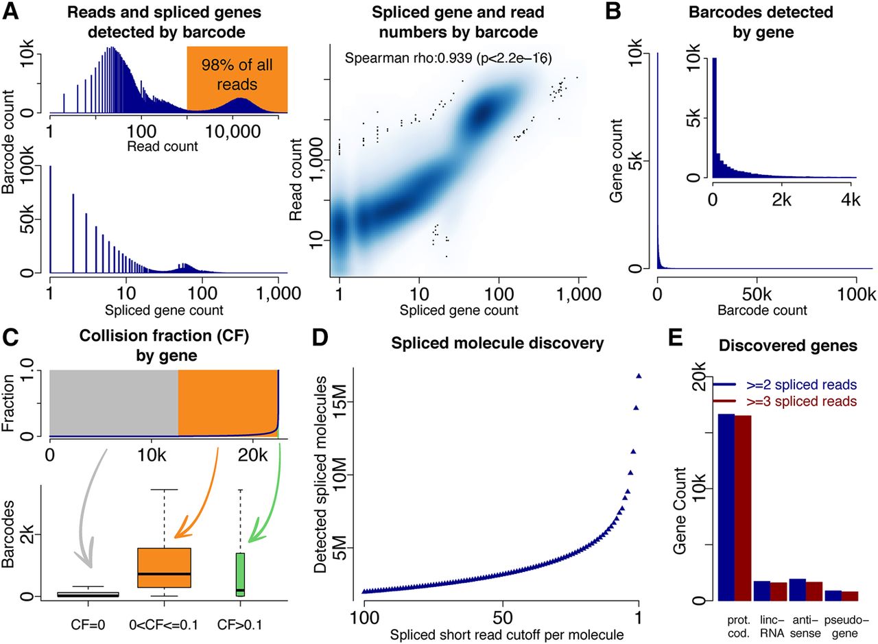 Molecule and gene identification using deep sequencing. (A) Histogram of read counts for all barcodes (top left), histogram of splice gene count for all barcodes (bottom left), and dotplot of spliced genes and short reads per barcode. (B) Histogram of barcodes per gene. (C) Percentage of barcodes with a collision for each gene; genes are ordered by collision fraction (top). Gene expression as measured by barcode number for many genes without collisions (gray), many genes with few collisions (yellow), and for very few genes with many collisions (green—not observable in top plot because of very low gene number). (D) Number of spliced molecules identified depending on how many spliced short reads identify an intron of the molecule's gene. (E) Numbers of genes identified in four gene classes (protein-coding genes, lincRNA genes, antisense genes, and pseudogenes).