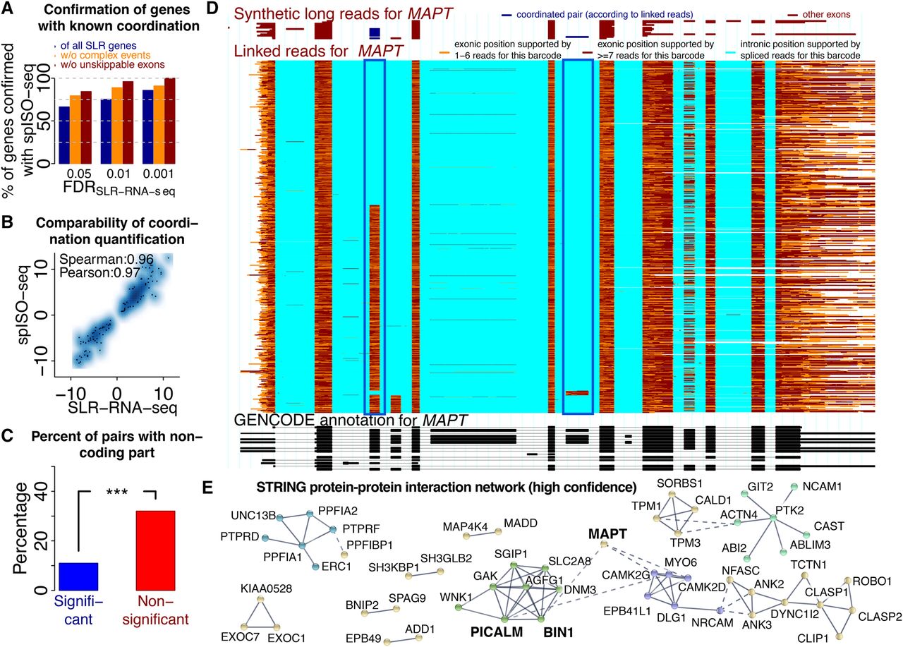 Coordinated exon pairs and influences on protein–protein interactions. (A) Percentage of genes with coordination events found by SLR-RNA-seq at three different FDRs that are also found with spISO-seq at FDR of 0.05. Blue bars: all SLR-RNA-seq coordination genes; orange bars: only SLR-RNA-seq genes, in which most molecules (Methods) show only exon inclusion and exon exclusion; brown bar: only SLR-RNA-seq genes, in which most molecules (Methods) show only exon inclusion and exon exclusion and where skipping events are mappable using short reads and STAR (Dobin et al. 2013). (B) Dotplot for extent of coordination according to SLR-RNA-seq and spISO-seq for cases in which both technologies indicate coordination. (C) Percentage of genes in which coordinated exons contain noncoding sequence for genes with coordination (FDR < 0.05) and without. (D) Single gene view for the MAPT gene, the center of all tauopathies. Bottom, black track: GENCODE annotation. Middle, colored track: spISO-seq data, with each line representing one molecule. Top, red-brown track: SLR-RNA-seq data with each line representing one molecule. Blue boxes highlight the inclusion of two alternative exons, whose inclusion is anticorrelated. (E) Protein–protein interaction network for genes with splicing coordination.