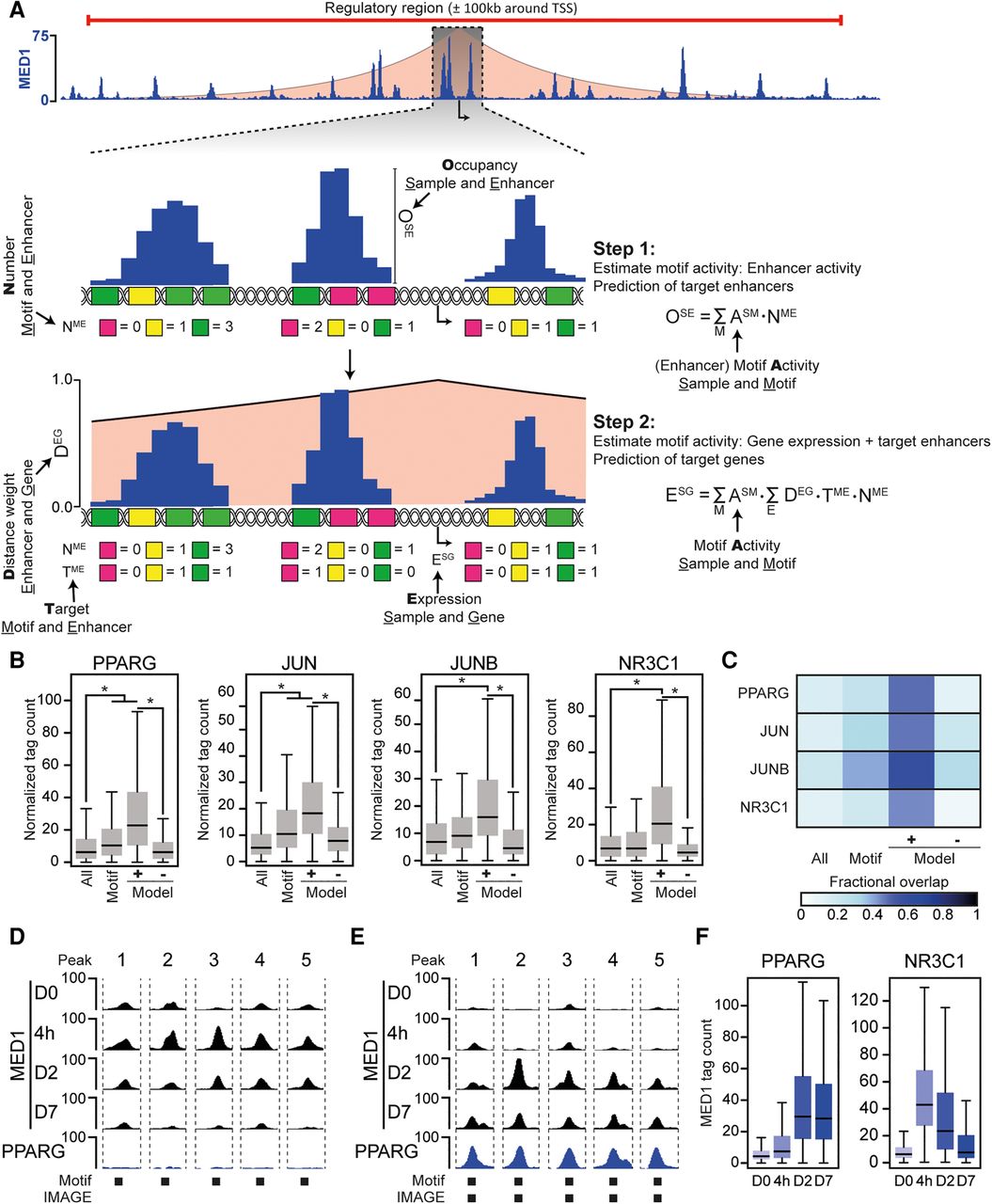 IMAGE predicts transcription factor binding sites with high confidence. The predictive power of IMAGE for identification of transcription factor binding sites was investigated using previously published data from 3T3-L1 preadipocyte differentiation (Siersbaek et al. 2011, 2017). (A) Schematic workflow of IMAGE. The shaded red area depicts the linear-distance association between enhancers and genes. The height illustrates the weight associated with each distance (y-axis on zoom-in). In step 1, the input sequences are scanned for motif occurrences using the P-value-based cut-off. Motifs that are only predicted to bind transcription factors that are expressed below one normalized tag per kilobase are filtered away. We define a variable M, which contains each remaining motif, a variable E which contains each enhancer, and a variable S which contains each sample. The motif activity of each remaining motif is determined using ridge regression to estimate ESM using the equation given in the figure. (OSE) Occupancy at enhancer E in sample S, (NME) number of motif M in enhancer E, (ESM) effect of motif M in sample S. Subsequently, target enhancers are predicted by leave-one-out analysis. In step 2, the effect of each motif on gene expression or motif activity is predicted using an additive model of transcriptional regulation and estimating ASM from the given equation. (DEG) Distance weight for enhancer E acting on gene G, (TME) target enhancer E of motif M, (NME) number of motif M at enhancer E, (ASM) motif activity of motif M in sample S. Subsequently, target genes are identified by leave-one-out analysis. (B,C) Validation of IMAGE binding site prediction during 3T3-L1 adipocyte differentiation using ChIP-seq. (B) Boxplots show the ChIP-seq occupancy of PPARG (6 d after induction of differentiation), JUN (4 h after induction of differentiation), JUNB (4 h after induction of differentiation), and NR3C1 (4 h after induction of differentiation) (Siersbaek et al. 2014) at either all putative enhancers defined by MED1 signal (all), all putative enhancers containing the respective transcription factor motif (motif), all enhancers predicted to be target enhancers of the transcription factor by IMAGE (Model+), or all enhancers predicted not to be target enhancers of the transcription factor by IMAGE (Model−). (*) denotes a significant (P ≤ 0.05) and nonnegligible effect (|Cohen's d| ≥ 0.2). (C) Heat map indicating the fraction of the MED1 binding sites defined in B that overlap with peak-detected sites based on ChIP-seq data. (D,E) Examples of MED1-bound enhancers with PPARG motifs that are unbound ([D] Peak 1: Chr 3: 151738674, Peak 2: Chr 8: 11273745, Peak 3: Chr 11: 51687839, Peak 4: Chr 2: 167420113, Peak 5: Chr 3: 41234389) or bound ([E] Peak 1: Chr 6: 144702629, Peak 2: Chr 6: 82598119, Peak 3: Chr 7: 29610142, Peak 4: Chr 11: 98447544, Peak 5: Chr 4: 108506609) by PPARG. Screenshots were generated using the USCS Genome Browser showing MED1 ChIP-seq data from day 0, 4 h, day 2, and day 7, and PPARG ChIP-seq data from day 6 following adipogenic stimulation of 3T3-L1 preadipocytes. Presence of PPARG motifs and IMAGE predicted binding sites is indicated below the screenshots. (F) Predicted enhancers of PPARG and NR3C1 have a temporal pattern of activation that is congruent with the activation of the transcription factors. The boxplots show the MED1 tag count at predicted target enhancers of PPARG and NR3C1 at the indicated time points during differentiation in 3T3-L1 cells.