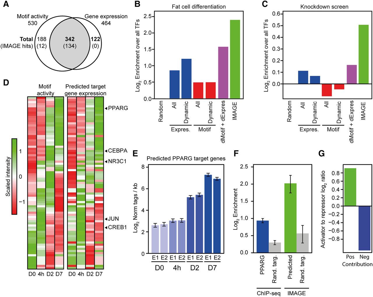 IMAGE identifies regulators of adipogenesis with high confidence. The predictive power of IMAGE for identification of important transcriptional regulators was investigated using previously published data from 3T3-L1 preadipocyte differentiation (Siersbaek et al. 2011, 2014, 2017). (A) IMAGE predicts causal regulators of 3T3-L1 adipocyte differentiation, including many that are not differentially expressed during differentiation. The Venn diagram shows the overlap between transcription factors with a significant change in IMAGE motif activity based on MED1 ChIP-seq (n = 2) and RNA-seq (n = 2) during 3T3-L1 adipogenesis, and transcription factors with a significant change in gene expression (RNA-seq, n = 2) at any point during differentiation. The numbers represent all transcription factors that have significant changes in motif activity and/or gene expression. Numbers in parentheses indicate the subset identified by IMAGE as high or medium confidence causal transcription factors. (B,C) Comparison of the predictive power of IMAGE and various other methods for predicting transcriptional regulators of adipogenesis previously defined as belonging to the GO term ‘fat cell differentiation’ (B), or previously identified in a knockdown screen to affect lipid accumulation during 3T3-L1 adipocyte differentiation (Söhle et al. 2012) (C). The bar plot shows the predictive power of the indicated methods as determined by the enrichment of the predicted factors over all transcription factors. The different methods compared with IMAGE are: (1) random selection (Random); (2) all expressed transcription factors (≥1 log2-transformed read per kilobase) (Expres., All); (3) all expressed and differentially expressed transcription factors (≥1 log2-transformed read per kilobase and Padj ≤ 0.05) (Expres., Dynamic); (4) all transcription factors whose motif is significantly enriched in MED1-bound enhancers compared to genomic background (Motif, All); (5) transcription factors whose motif is significantly enriched in differentially regulated enhancers (Padj ≤ 0.05) compared to genomic background (Motif, Dynamic); and (6) integration of the groups containing dynamically expressed transcription factors and transcription factors with motif enrichment in differentially regulated enhancers compared to genomic background (dMotif + dExpress). (D) Motif activities recapitulate the transcriptional waves during adipocyte differentiation in 3T3-L1 cells. Heat map of motif activity of all motifs with significant changes in motif activity during 3T3-L1 differentiation (left panel) and average expression of predicted target genes of these motifs (right panel) at the different time points following induction of differentiation, day 0, 4 h, and day 2 and day 7. (E) Example showing the average mRNA expression of genes predicted by IMAGE to be regulated by PPARG. Bar plot shows average gene expression for target genes of two replicates (E1 and E2) during 3T3-L1 differentiation. (F) Comparison of prediction of PPARG target genes based on IMAGE and based on PPARG ChIP-seq. The bar plot shows the enrichment of predicted PPARG target genes (predicted using either PPARG ChIP-seq data [Siersbaek et al. 2011] or IMAGE) among the group of PPARG-dependent genes (Schupp et al. 2009). PPARG-dependent genes are defined as genes significantly regulated during adipogenesis in 3T3-L1 control cells (Padj ≤ 0.01) but with at least twofold less repression or induction upon knockdown of PPARG in mature 3T3-L1 adipocytes. The enrichment of IMAGE-predicted or ChIP-seq-predicted (PPARG peak within ±25 kb of the transcription start site) target genes is calculated by comparing the fraction of predicted target genes that are experimentally defined as PPARG-dependent relative to a randomized control fraction using size-matched randomized groups of target genes and dependent genes. Background enrichment was estimated by 1000 permutations of randomizing the predicted target genes and calculating the same enrichment. The error bars indicate the standard deviation across 1000 permutations. (G) Motif activity can be used to distinguish between transcription activators and repressors. The bar plot shows the log2 ratio between the Jaccard similarity coefficient between motifs with significantly positive (P ≤ 0.05, motif activity ≥ 0.005) motif activity at day 7 of differentiation and transcription factors only marked as activators in the UniProt annotation, or motifs with significantly negative (P ≤ 0.05, motif activity ≤ −0.005) motif activity at day 7 of differentiation and transcription factors only marked as repressors in the UniProt annotation (Apweiler et al. 2004).