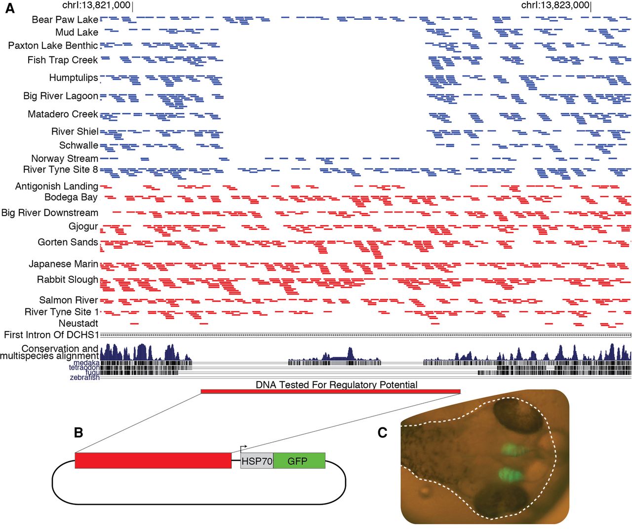 Freshwater deletions in DCHS1 remove a conserved sequence that functions as a telencephalon enhancer. (A) The majority of freshwater populations do not have any reads (blue bars) mapping to a region within the first intron of DCHS1, but the marine populations (red bars) appear to universally contain this piece of DNA. The deleted region encompasses an element that shows cross-species conservation with medaka. (B) We cloned three copies of this region upstream of the HSP70 minimal promoter and GFP reporter to test its regulatory potential. (C) We injected this construct into fertilized eggs and multiple transgenic lines show GFP expression in the developing brain at 5 d post-fertilization (dotted white line shows the outline of the embryo within the egg).