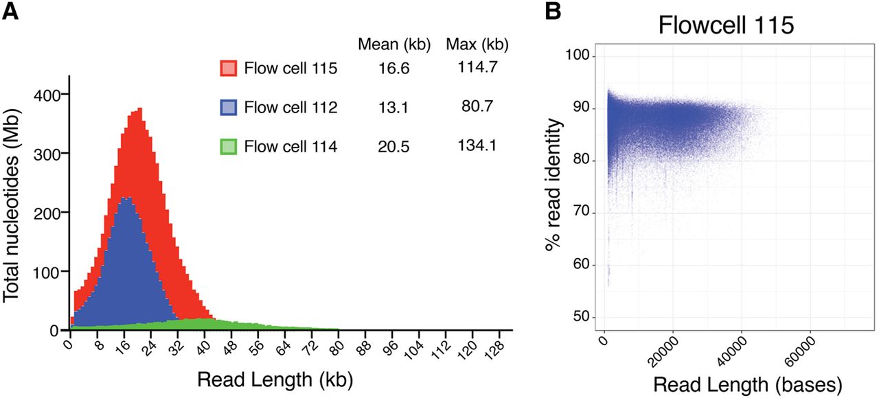 Summary of MinION sequence reads of the C. elegans VC2010 wild-type strain genome. (A) Histograph of read lengths from flow cells 112, 114, 115. (B) Plot of % read identity aligned to the C. elegans reference genome vs. read length from flow cell 115. Mean % identities ranged from 85.90% to 86.35% for the three flow cells (Supplemental Fig. S1).