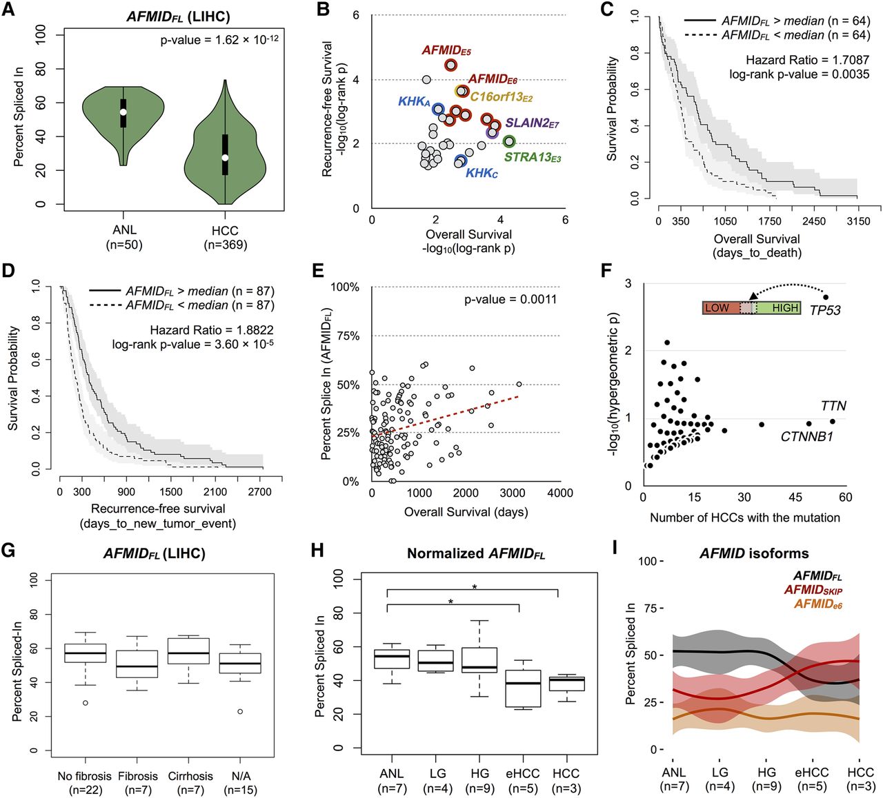 The switch of AFMID isoforms is associated with patient outcome and is already evident in early-stage HCC. (A) The vioplot shows the PSI distribution of AFMIDFL isoform in adjacent normal livers (ANLs) and HCCs in the LIHC data set of TCGA. (B) The dot plot summarizes the log-rank P-values of each alternative exon from overall (x-axis) and recurrence-free (y-axis) survival analysis, based on the LIHC data set of TCGA. Each circle represents one alternative exon. Alternative exons from the same gene are labeled with the same color. (C,D) The plots show the survival curves of AFMID-high and AFMID-low patients, based on the PSIs of the AFMIDFL isoform in overall and recurrence-free survival analysis, respectively. The PSI of the AFMIDFL isoform was determined by using the PSI of exon 5. (E) The dot plot shows the correlation between the PSI of the AFMIDFL isoform and overall survival days. (F) The plot shows the enrichment (y-axis) of mutated genes in high-AFMIDFL or low-AFMIDFL HCCs, based on the LIHC data set of TCGA. The x-axis shows the number of HCCs carrying the mutated gene. Each dot represents one gene mutated in at least one of the HCC samples. The bar labeled TP53 demonstrates that there are more TP53-mutated HCCs (light gray bar) in low-AFMIDFL HCCs (red bar). (G) The box plots show the PSIs of the AFMIDFL isoform in ANLs from patients with no fibrosis, fibrosis, or cirrhosis, in the LIHC data set. N/A means that the annotation of the liver sample was not available. (H) The box plot shows the PSI distribution of the AFMIDFL isoform in ANLs, low-/high-grade dysplastic lesions (LG/HG), early HCCs (eHCC), and HCCs. (I) The plot shows the PSI patterns of AFMIDFL(black), AFMIDSKIP(red), and AFMIDe6 (orange) isoforms in different groups of liver samples.