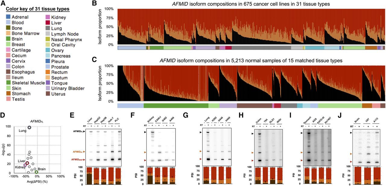 The switch of AFMID isoforms in cancers. (A) The color key of 31 tissue types. (B) The stacked bar chart shows the proportions of AFMID isoforms (AFMIDFL: black, AFMIDSKIP: red, and AFMIDe6: orange) in 675 cancer cell lines, based on RNA-seq analysis. (C) The stacked bar chart shows the proportion of AFMID isoforms in noncancer samples of 15 matched tissue types. (D) The dot plot shows the average ΔPSI between noncancer samples and cancer cell lines from the same tissue type. The x-axis is the average ΔPSI, and the y-axis shows the statistical significance (−log10[P-value]) of the ΔPSI. (E–J) The six panels show radioactive RT-PCR results of AFMID isoforms in normal tissues and cancer cell lines from liver, kidney, lung, colon, stomach, and brain, respectively (24 amplification cycles). The three arrowheads on the left indicate the expected sizes of AFMIDFL, AFMIDe6, and AFMIDSKIP isoforms, respectively. The stacked bar chart below each RT-PCR plot shows the average PSI values and standard deviations from triplicate experiments. The PSI bars of AFMIDFL, AFMIDe6, AFMIDSKIP, and unknown bands are colored in black, orange, red, and gray, respectively.