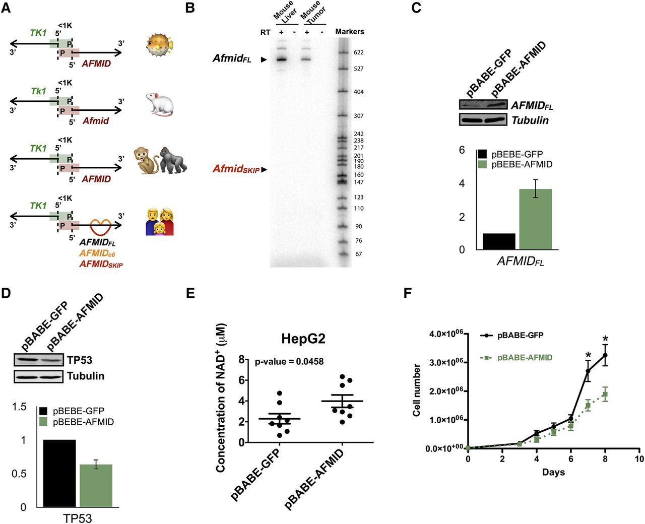 Phylogenetic comparisons of AFMID splicing patterns and functional experiments of the AFMIDFL isoform. (A) The bidirectional gene pair, TK1 and AFMID, is a conserved structure in Fugu, mouse, monkey, gorilla, and human (from top to bottom). The black arrows indicate the direction of transcription for each gene. The promoter region is indicated by green and red bars for TK1 and AFMID, respectively. The distance between the two transcription start sites is <1 kb. In the human diagram, the red arc indicates the AFMIDSKIP isoform, and the orange arcs represent the AFMIDe6 isoform. (B) Radioactive RT-PCR analysis of Afmid isoforms in mouse liver and tumor samples. Expected sizes of isoforms are labeled on the left. Size markers are shown on the right. (C,D) Representative Western blots at the top show (C) AFMIDFL and (D) TP53 levels in HepG2 cells, respectively. HepG2 cells with a GFP plasmid are labeled pBABE-GFP, and HepG2 cells with an AFMIDFL plasmid are labeled pBABE-AFMID. The bar charts below show the quantifications of Western blots from triplicate experiments. (E) The plot shows the NAD+ levels in HepG2 cells with pBABE-GFP or pBABE-AFMID from eight biological replicates. (F) Cell growth curves of HepG2 cells with pBABE-GFP (black) or pBABE-AFMID (green) are shown. Error bars indicate SEM. (*) P < 0.05.