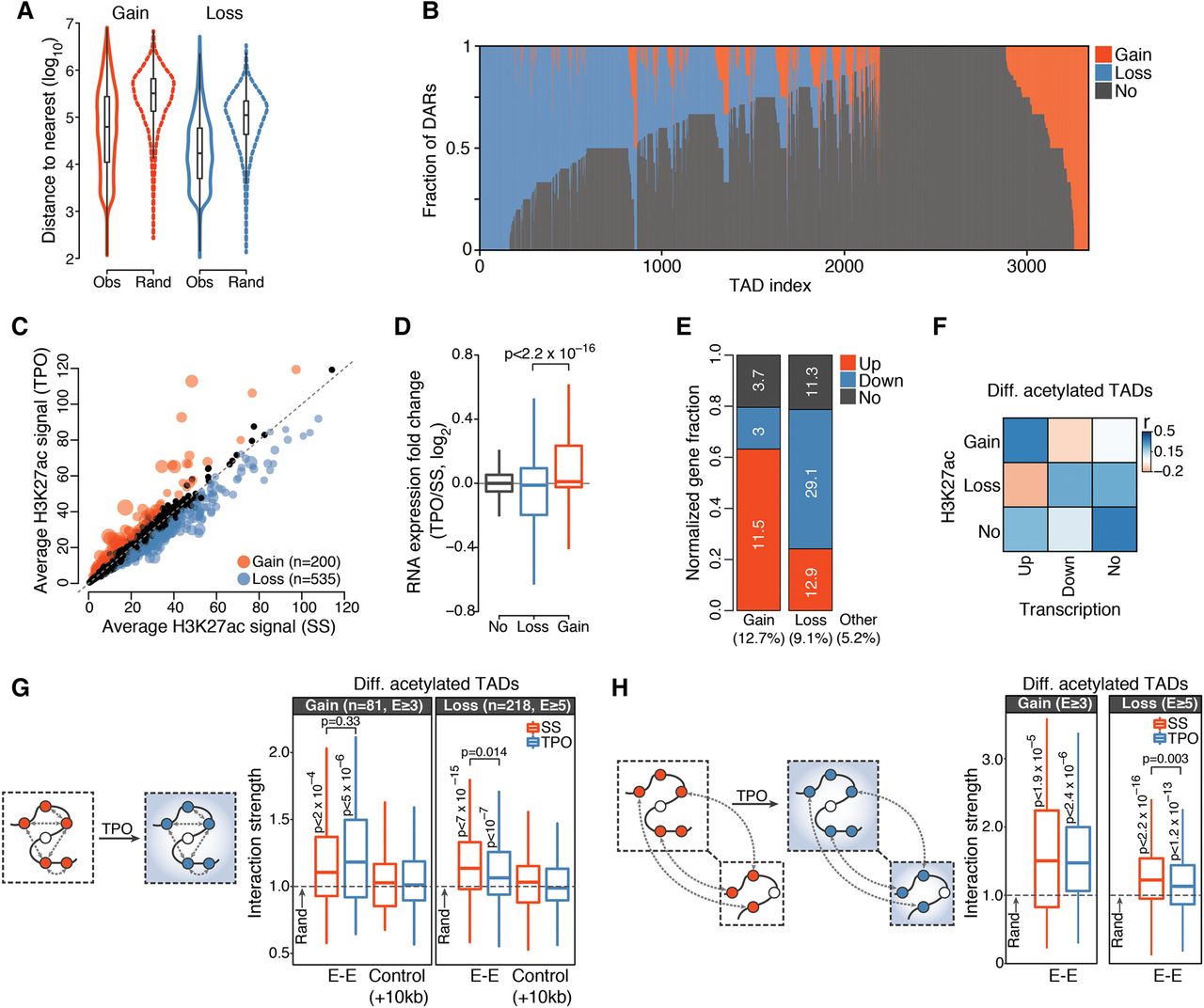 Cis-regulatory responses to TPO are spatially coordinated within the nucleus. (A) Distribution of observed (Obs) and expected (Rand) (Methods) genomic distances between nearest homotypic DARs. (B) Distribution of DARs within TADs detected in serum-starved HPC-7 cells and containing at least one H3K27ac region. Each TAD corresponds to a vertical line. (C) Average normalized H3K27ac signals per kilobase of TAD. Significantly differentially acetylated TADs are highlighted. Point sizes are proportional to −log10(Q-value). (D) Distribution of chromatin-associated RNA expression fold changes of genes localized within differentially acetylated TADs. P-value is from a Wilcoxon rank-sum test. (E) Relative fraction of differentially transcribed genes localized within differentially acetylated TADs, normalized by total number of genes within each category. The percentage of genes in each category is indicated inside the bar plot, whereas the percentage of differentially transcribed genes falling within each TAD class is indicated at the bottom. (F) Spearman's rank correlation matrix between frequency of DAR and frequency of differentially transcribed genes within differentially acetylated TADs. (G) Structured interaction matrix analysis (SIMA) of enhancer–enhancer interactions for differentially acetylated enhancers within differentially acetylated TADs. The interaction strength reflects the enrichment of Hi-C interactions relative to randomly sampled genomic regions. Interaction strength distributions for matched controls (Methods) are also shown. P-values are from a Wilcoxon signed rank test (for testing differences from random interactions) and from a Wilcoxon rank-sum test (for comparison between conditions). (H) Same as G, for enhancer–enhancer interactions between differentially acetylated TADs located within 20 Mb blocks.