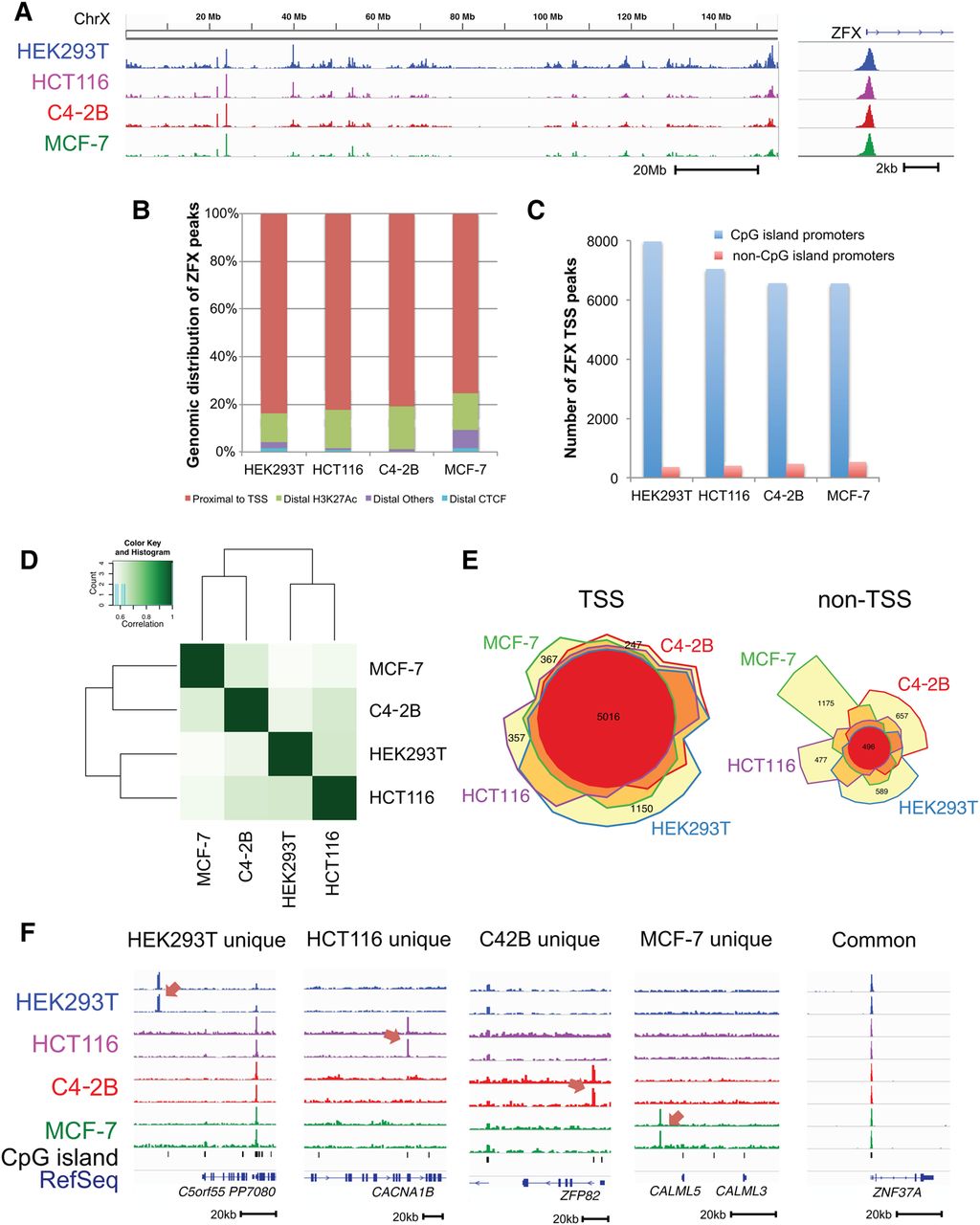Genome-wide ZFX binding profiles in multiple types of human tumors. (A) ZFX ChIP-seq data for a region of ∼150 Mb of Chromosome X for HEK293T kidney, HCT116 colon, C4-2B prostate, and MCF-7 breast cancer cells (left) and for a region of ∼6 kb near the ZFX promoter (right). (B) The percentage of ZFX binding sites in promoters (±2 kb from the TSS), distal enhancers (H3K27ac), distal insulators (CTCF not in enhancers), and at other locations is shown for ZFX ChIP-seq data for four cell types. (C) The number of ZFX binding sites located in CpG island promoters versus non-CpG island promoters is shown for the four cell types. (D) Heatmap of the ChIP-seq signal correlation for ZFX binding sites in the four tumor types. (E) Venn diagrams of ZFX binding sites near promoters (left) and distal regions (right) for HEK293T kidney, HCT116 colon, C4-2B prostate, and MCF-7 breast cancer cells. (F) Examples of cell-type–specific and common ZFX binding sites.