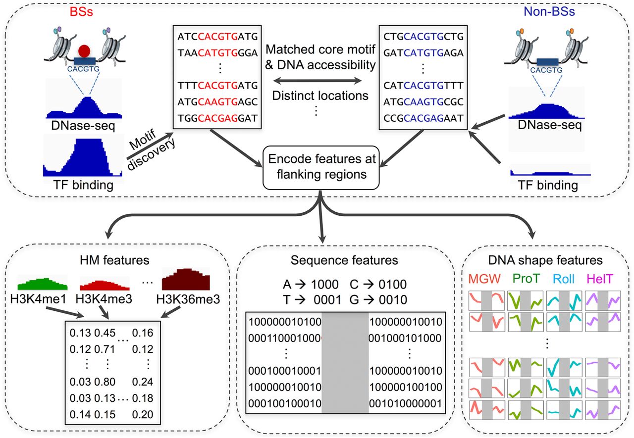 Flowchart describing the approach of modeling BSs and non-BSs with DNA sequence, DNA shape features at flanking regions, and HM features. In each cell line, chromatin-accessible regions derived from DNase-seq data were genomic regions of interest. For each TF, sequences at ChIP-seq peaks were first aligned using position frequency matrices (PFMs) to obtain BSs. For each BS, an exactly matched motif was found from chromatin-accessible and distinct genomic regions as a motif pool. Within the motif pool, motif sets with similar chromatin accessibility distributions as the BSs were selected as non-BSs. With a set of BSs and non-BSs, DNA sequence and four DNA shape features, as well as 10 HM patterns, were calculated for flanking regions and fed to downstream modeling to distinguish BSs and non-BSs.