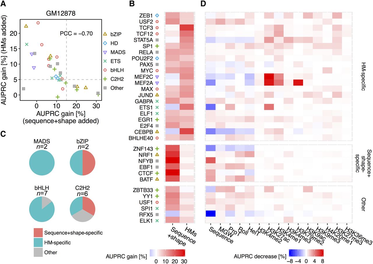 Deconvolution of DNA sequence and shape features at flanking regions and 10 HM patterns in the GM12878 cell line. (A) Scatter plot showing performance gain through adding different sets of features. The x-axis represents HM pattern-only models as baseline, and recorded performance increases through adding DNA sequence and shape features at flanking regions. The y-axis represents models based on DNA sequence and shape features at flanking regions as baseline, and recorded performance increases through adding HM pattern features. Gray dashed lines intersect with x-axis at 15% and with y-axis at 5%. The Pearson correlation coefficient (PCC) was calculated between AUPRC gain through adding these two sets of features. (B) Heat map displaying performance gains when adding either sequence+shape features or HM patterns. With cutoffs as shown by the gray dashed line in A, TFs were grouped into sequence+shape specific, HM specific, and a group with other features preferred. (C) Pie charts showing the number of TFs with different binding mechanisms in the MADS-domain, bHLH, bZIP, and C2H2 TF families. (D) Heat map representing the percentage decrease of AUPRC in leave-one-feature-out experiments compared to complete models considering DNA sequence and shape features, and 10 HM features. A more intense red color in a cell indicates a greater performance decrease when leaving out the feature displayed in the x-axis for the TF displayed in the y-axis.