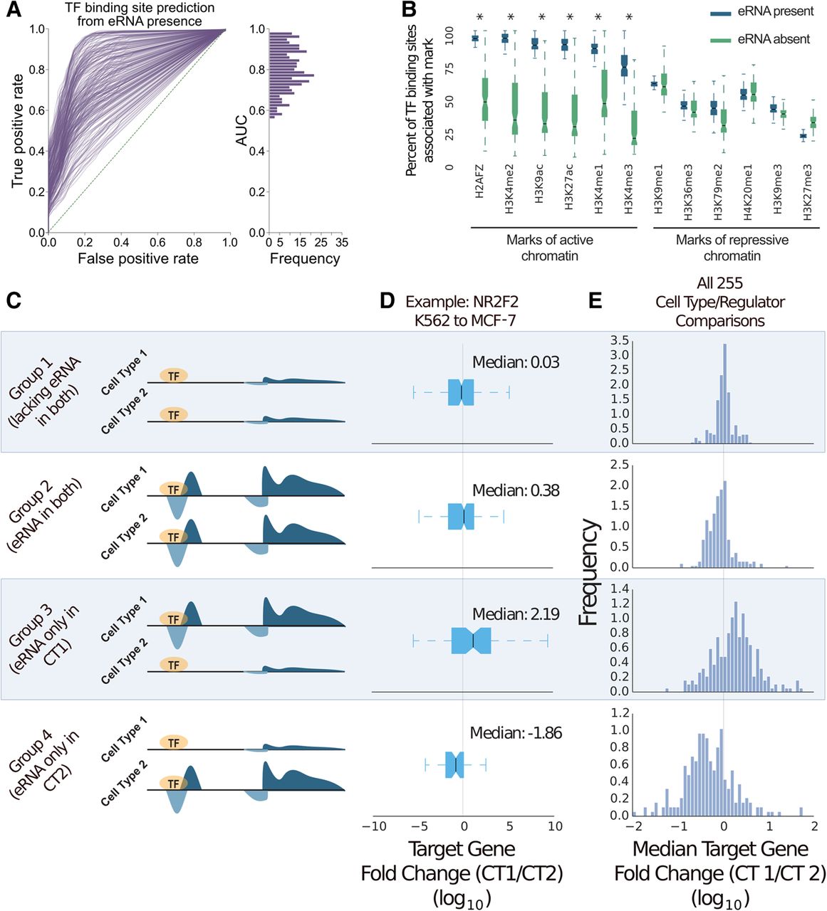 Enhancer RNA (eRNA) presence marks the active subset of TF binding. (A) ROC analysis of TF binding site prediction via eRNA presence. False-positive and true-positive rates are varied by thresholding the penalized likelihood ratio statistic generated from Tfit. (B) TF binding peaks (Supplemental Table S1) were grouped according to eRNA association. A box-and-whiskers displays the median/variability in proportion of histone mark association between the groups across all TFs (Supplemental Table S1). Asterisks indicate a P-value <10−10 by z-test. All data in A and B are K562 cells. (C) Pairwise cell type–associated TF binding peaks were grouped according to eRNA presence from matched cell types (Supplemental Table S2). A gene was considered “neighboring” by a distance <10 kb. (D) Log base 10 FPKM fold change of “neighboring” genes related to eRNA-grouped NR2F2 binding peaks. (E) Histogram of Log base 10 FPKM fold change of “neighboring” genes for all possible eRNA-grouped TF ChIP-seq data sets (n = 255).