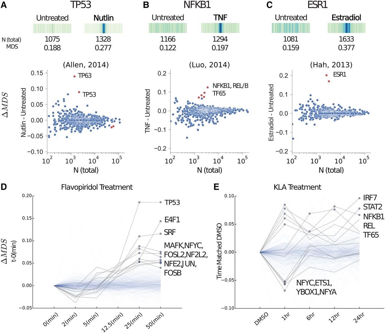 MD-scores predict TF activity. (A, top) The MD distribution, MD-score, and the number of motifs within 1.5 kb of any eRNA origin before and after stimulation with Nutlin-3a (e.g., Nutlin) on TP53 (Allen et al. 2014), the TF known to be activated. (Bottom) For all motif models (each dot), the change in MD-score (ΔM DS) following perturbation (y-axis) relative to the number of motifs within 1.5 kb of any eRNA origin (x-axis). Red points indicate significantly increased and/or decreased MD-scores, respectively (P-value <10−6). Similar analysis for TNF activation of the NF-κB complex (B) (Luo et al. 2014) and estradiol activation of estrogen receptor (ESR1; C) (Hah et al. 2013). (D) A time series data set following treatment with flavopiridol (Jonkers et al. 2014). The y-axis indicates the MD-score change relative to time point zero. Blue dots indicate a MD-score difference <10−6. A darker shaded line indicates a time trajectory with at least one significant MD-score. (E) Time series data set following treatment with Kdo2-lipid A (KLA) where each time point is normalized to time-matched DMSO (Kaikkonen et al. 2014). Therefore, the y-axis indicates MD-score difference relative to the time point–matched DMSO sample. NCBI Sequence Read Archive (SRA) SRR numbers of these comparisons are outlined in Supplemental Table S4.