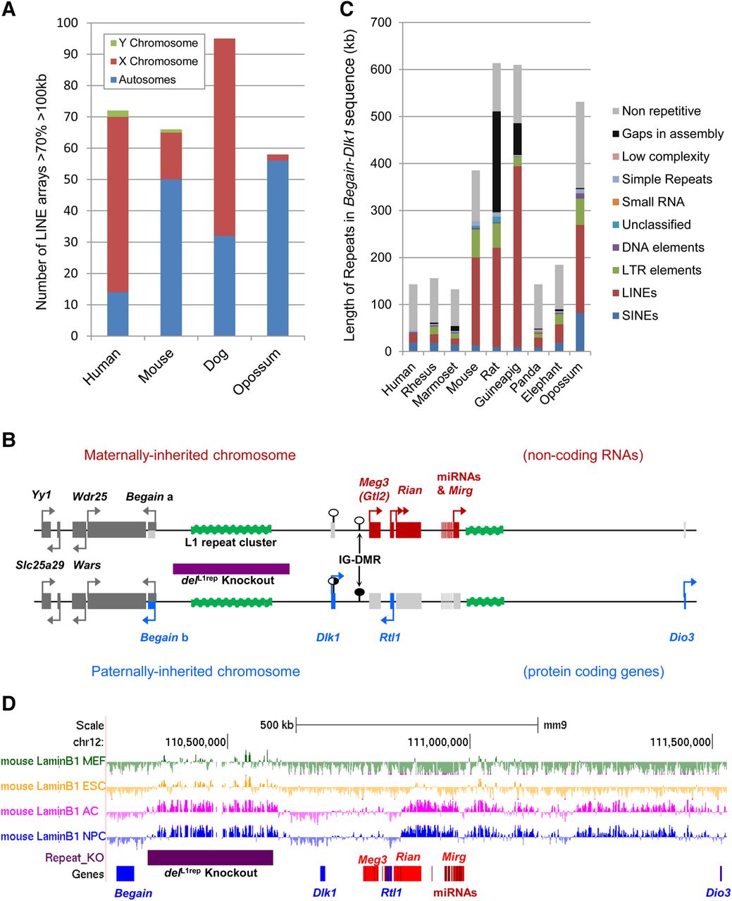 Distribution of LINE-rich arrays in mammalian genomes and identification of a large, intergenic LINE-rich repeat array in the mouse Dlk1-Dio3 imprinted gene cluster. (A) Chromosomal distribution of LINE-rich arrays of >70% LINE over >100 kb in the human, mouse, dog, and opossum genomes. In the mouse genome, LINE-rich arrays of >70% LINE extending over 100 kb are associated with vomeronasal and olfactory receptor genes. (B) The LINE-rich repeat cluster (green) is flanked by the Dlk1-Dio3 imprinted domain. Maternally expressed noncoding transcripts are shown in red, and paternally expressed protein coding genes are shown in blue. On the maternally inherited chromosome, noncoding RNAs Meg3 (Gtl2), Rtl1 anti-sense (AS), Rian, and microRNA-containing Mirg (red) are transcribed, whereas the protein-coding genes (light gray) are repressed. The paternally inherited chromosome expresses protein-coding Begain variant 1b, Dlk1, Rtl1, and Dio3 (blue), and silences the transcription of the noncoding RNAs (light gray). The imprinting control region (IG-DMR) and the Dlk1 DMR are unmethylated on the maternally inherited chromosome (white circles), and hypermethylated/partially methylated, respectively, on the paternally inherited chromosome (black and shady gray circles). Biallelic genes are shown in dark gray, and arrows denote the direction of transcription. (C) The total repeat coverage in the Begain-Dlk1 intergenic region in nine mammalian species illustrates the accumulation of LINE elements in the rodent lineage. Repeat content was ascertained using the RepeatMasker web server (Smit et al. 2015). (D) The mouse Dlk1-Dio3 intergenic LINE array between Begain and Dlk1 (purple bar) coincides with a facultative lamina-associated domain (fLAD) in astrocytes and neural precursor cells (Peric-Hupkes et al. 2010). Image taken from UCSC Genome Browser (Kent et al. 2002).