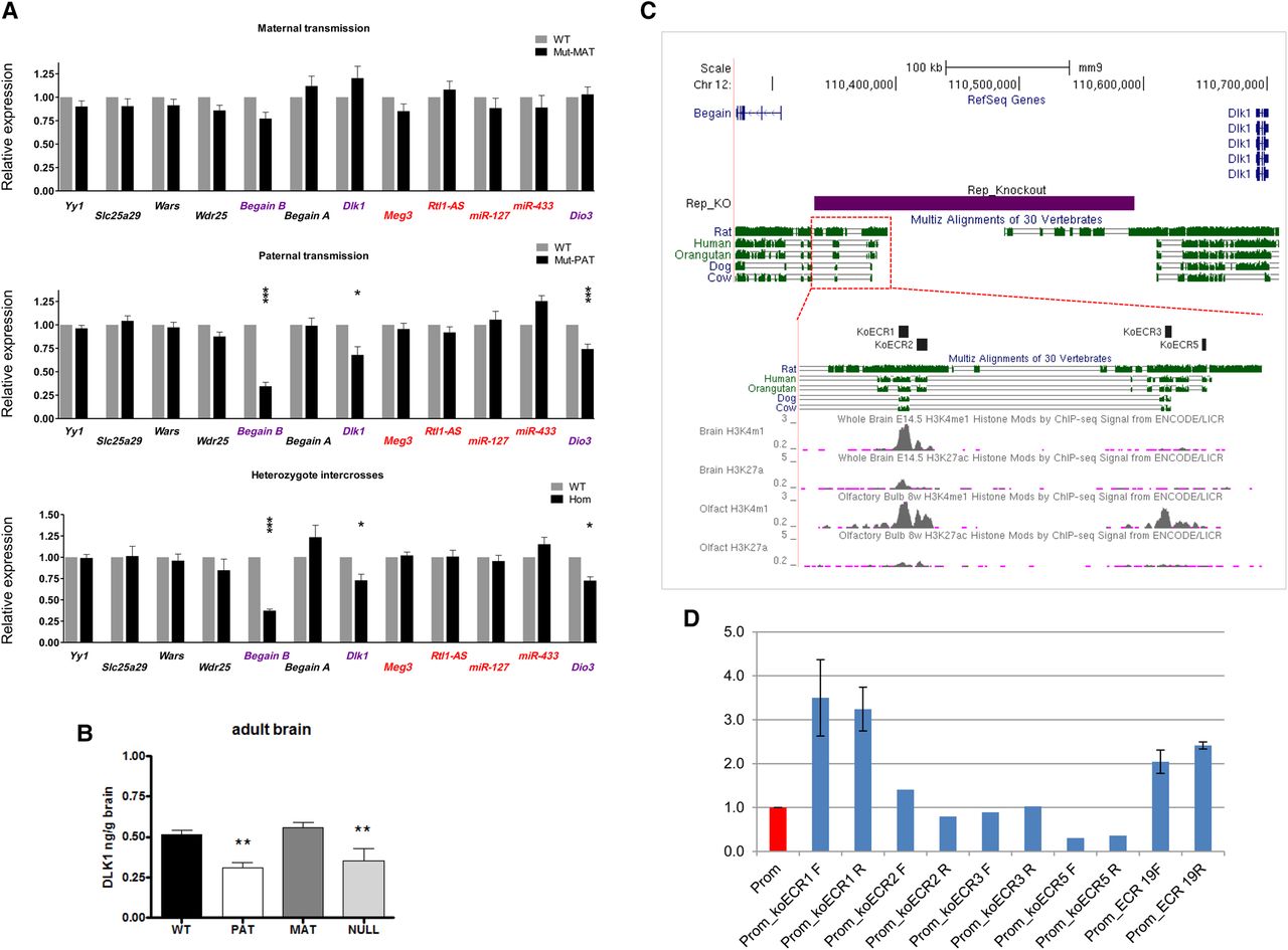Paternal transmission of delL1rep results in temporal- and tissue-specific disruption of imprinted gene expression on the paternal chromosome. (A) Relative expression of five biallelic genes closest to the deleted interval (black) and of the transcripts within the neighboring imprinted cluster ([blue] paternally expressed; [red] maternally expressed) in fetal (E16.5) brain, as determined by RT-qPCR. (Upper) No significant differences in expression were observed upon maternal transmission of the delL1repallele (n = 12 wt, 14 mut; four litters). (Middle) Paternal inheritance of the delL1repallele elicited a significant down-regulation of all of the paternally expressed genes (n = 13 wt, 13 mut; four litters). (Lower) The effect of delL1repon the expression of Begain b, Dlk1, and Dio3 was closely recapitulated in homozygous mutants (n = 12 wt, 13 mut; six litters). Maternally expressed miR-127 and miR-433 are part of larger transcripts (Rtl1-AS and Mirg, respectively) but have their own promoters and can be independently transcribed (Song and Wang 2008). Data were normalized to Gap3dh expression and are shown relative to WT controls (=1). (*) P < 0.05; (***) P < 0.001 by two-tailed Student's t-test. (B) DLK1 ELISA performed on wild type (WT), paternal transmission of delL1rep (PAT), maternal transmission of delL1rep (MAT), and homozygous adult brains (NULL). DLK1 protein levels in PAT and NULL are significantly lower than wild type: (**) P < 0.01 by ANOVA with Bonferroni's post hoc test. Error bars indicate SEM. (C) The delL1rep region contains two evolutionary conserved regions (ECRs) as identified from the UCSC conservation track. ENCODE data for the enhancer-associated histone modifications H3K4me1 and H3K27ac in whole brain and olfactory bulb are also shown. The purple box denotes the deletion region; black boxes show the position of four conserved subregions that were used for luciferase assays. Image taken from UCSC Genome Browser (Kent et al. 2002). (D) koECRs 1, 2, 3, and 5 were cloned into pGL3-Promoter (Promega) in both orientations to test for enhancer activity. Constructs were transfected into E16.5 neurospheres. Graph shows the expression as measured in luminescence of luciferase relative to Renilla and normalized to the empty pGL3-Promoter vector (Prom). ECR19 was previously shown to have enhancer-like activity in ESCs and was shown to bind EP300 in brain (Visel et al. 2009). Statistics were calculated by the one-way ANOVA (and nonparametric) Friedman test to calculate the overall statistical significance (P-value), followed by Dunn's Multiple Comparison post-test to calculate the statistical significance (P-value) between specific samples. P < 0.05 was deemed as statistical significant. (Prom) pGL3-Promoter empty vector.