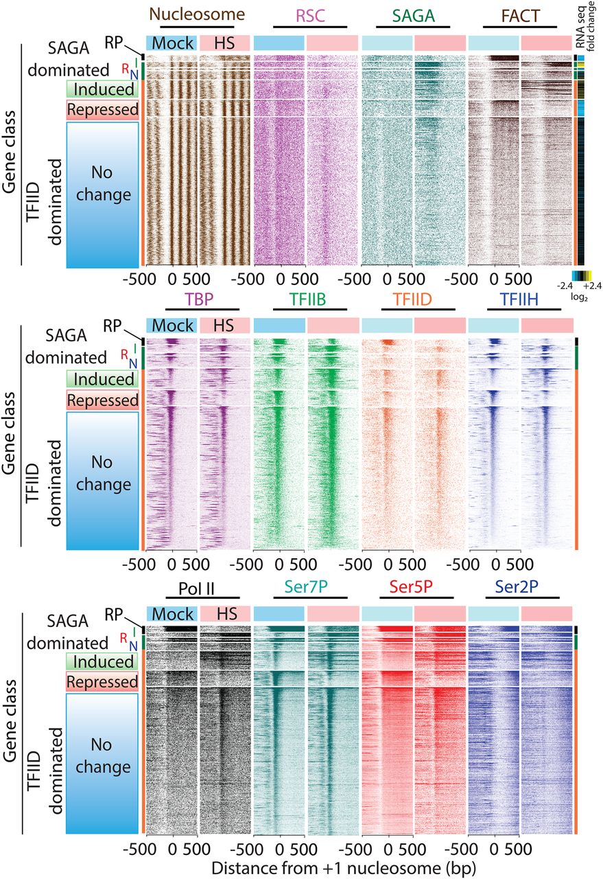 Segregated and sorted heat shock response. ChIP-exo tag 5′ ends were plotted from ±500 bp relative to +1 nucleosome dyads, panel-separated based on mock or 3 min of heat shock, segregated by gene class (RP, SAGA, TFIID) and then by increased/induced (I), decreased/repressed (R), or no changes (N) in TFIIH (Ssl2) occupancy upon heat shock: SAGA-dominated genes (I,R,N, n = 160, 55, 252, respectively), TFIID-dominated genes (I,R,N, n = 488, 353, 3358, respectively). Within each segregated group, rows were sorted by TFIIH occupancy in the region 100 bp upstream of to 100 bp downstream from the TSS. Also shown in the far upper right is a heat map of log2 fold-changes in mRNA expression after 15 min of heat shock, using data from Yassour et al. (2009).