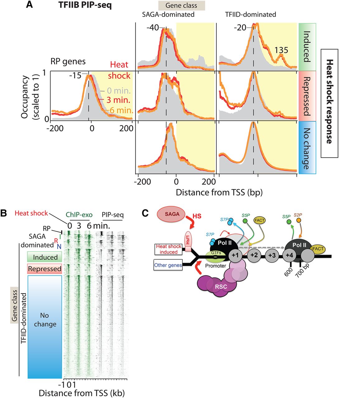 Melted PIC DNA is unaffected by Pol II accumulation in promoter regions. (A) Gene-averaged plot of TFIIB PIP-seq tag 5′ ends separated by gene class and heat shock response (i.e., changes in TFIIH occupancy). Mock, 3-, 6-min time points are indicated (gray fill, red trace, orange trace, respectively). Transcription is oriented to the right. Plots are scaled to 1. Transcribed regions have a yellow backdrop. Dashed line indicates position of transcription bubble upon heat shock. (B) Heat maps of TFIIB (Sua7) ChIP-exo (green), and PIP-seq (black) at 0, 3, and 6 min of heat shock. Gene classes are as in A. (C) Model for heat shock-induced reorganization of factors at most genes whose expression does not change, and genes whose expression is heat shock-induced.