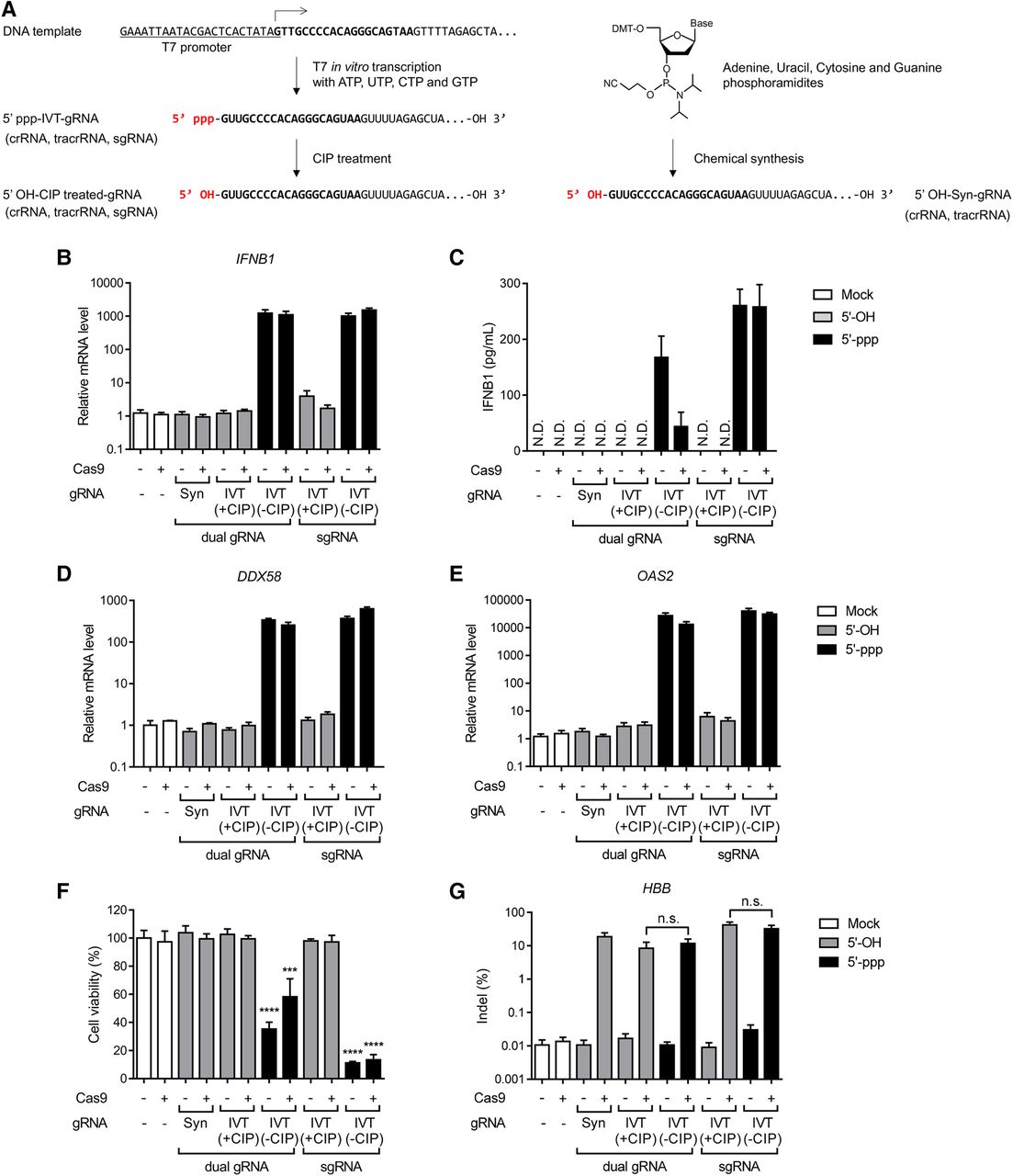 Induction of type I interferon-mediated innate immune responses in HeLa cells by in vitro–transcribed gRNA containing 5′-triphosphate. (A) Schematic representation of gRNA 5′ ends, which vary according to the gRNA preparation method. gRNA sequences complementary to the HBB-target site are shown in bold. (B,D,E) Relative IFNB1 (B), DDX58 (D), and OAS2 (E) mRNA levels 24 h after transfection. Error bars, SEM; n = 3. (C) IFNB1 levels were measured by ELISA. Error bars, SEM; n = 3. (N.D.) None detected. (F) Cell viabilities after RNP transfection were determined by WST-1 assays. Error bars, SEM; n = 2. Statistical significances between the different measurements were calculated using one-way ANOVA. (***) P < 0.001, (****) P < 0.0001. (G) Indel frequencies induced by the HBB-targeting Cas9 RNP were measured by targeted deep sequencing. Error bars, SEM; n = 3. Statistical significances were calculated by t-test. (n.s.) Not significant, (Syn) chemically synthesized guide RNA, (IVT) in vitro–transcribed gRNA, (±CIP) in vitro–transcribed gRNA with or without CIP treatment.