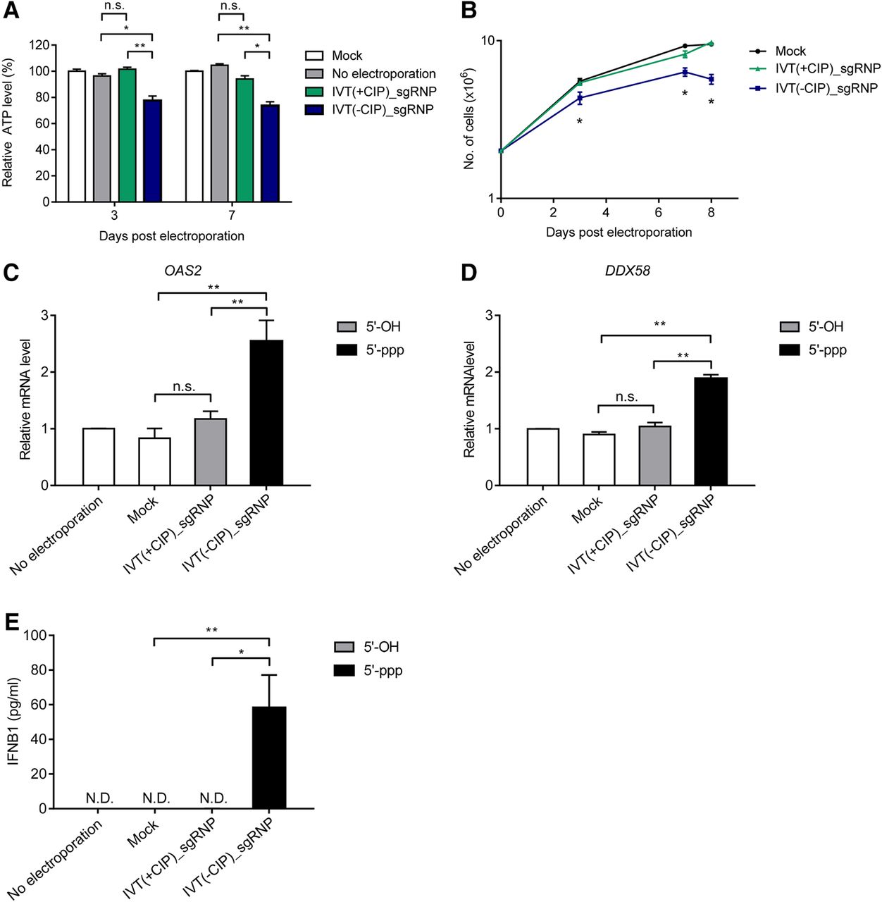 5′-triphosphate induces RNA-sensing immune responses in human CD4+ T cells. A CCR5-targeting Cas9 RNP was delivered into primary CD4+ T cells using a MaxCyte electroporation system. (A) Cell viabilities at 3 and 7 d post-electroporation were determined by relative ATP level. (B) Live cell numbers from day 0 to 8 were counted after RNP delivery. Relative OAS2 (C) and DDX58 (D) mRNA levels were determined by real-time PCR 3 d post-electroporation. (E) IFNB1 protein levels in the supernatant were measured by ELISA. Error bars, SEM; n = 3. Statistical significances were calculated by t-test. (*) P < 0.05, (**) P < 0.01, (n.s.) not significant.