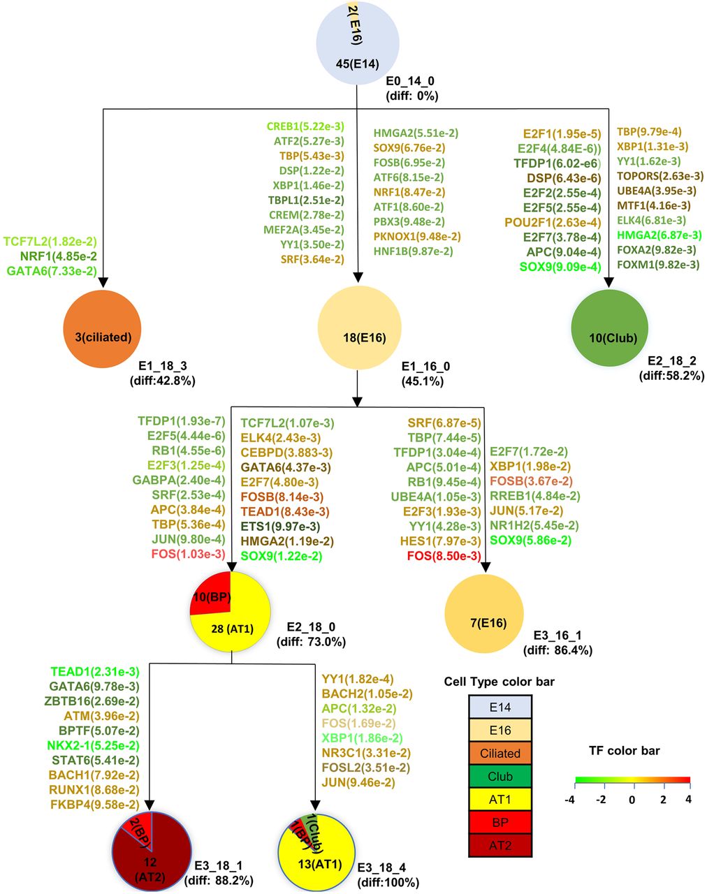 Differentiation model on Treutlein et al. (2014) lung single-cell data set. (diff) Differentiation stage 0% (most undifferentiated)–100% (most differentiated) from the first state. Number of cells assigned to each state was given inside the pie chart. Cell types for each state (node) are based on the assignments of Treutlein et al. (2014) and so are only available for cells in the last time point (E18.5); cells from earlier time points are labeled using the time point (E14, E16). TFs are associated with paths they are predicted to regulate and color-coded based on their expression change (fold change) along the regulated path. TF P-values are based on the set of targets associated with the states they are predicted to regulate.