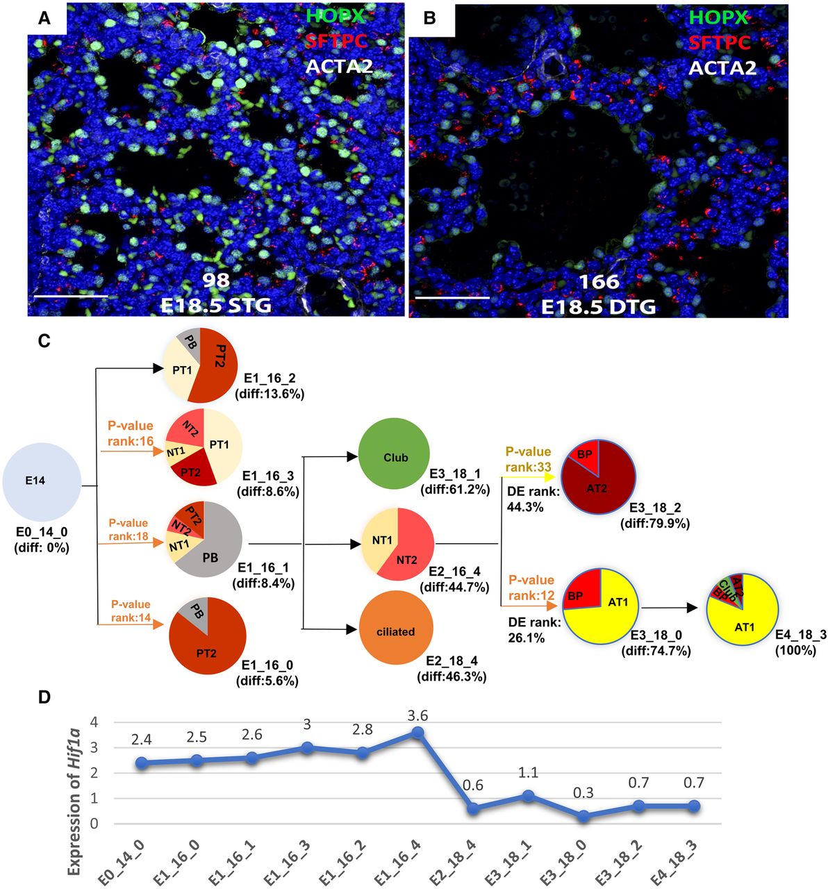 Increased HIF1A activity disrupts sacculation and influences AT1/AT2 cell distribution. (A,B) Experimental results for HIF1A staining. HIF1A (three-point mutant) was expressed under conditional control of SFTPC-rtTA, (otet)7-HIF1A-TPM. Doxycycline was provided to the dam from E12.5 to E18.5. Single transgene (STG) controls, lacking HIF1A-TPM expression (n=3), were compared with double transgenic (DTG) mice expressing HIF1A-TPM under doxycycline control in airway epithelial cells (n=4). Staining of lung tissue for ACTA2 (smooth muscle actin), HOPX (an AT1 cell marker), and SFTPC (proSP-C, and AT2 cell marker) are shown. (C) Model prediction for HIF1A. HIF1A is identified as a top regulator of AT1 cells (ranked as the 12th TF) with a lower, though still significant, impact on AT2 cells (ranking as the 33rd TF). (D) mRNA expression of Hif1a in the different states reconstructed by the model. As predicted by the model, OE of Hif1a influences AT1/AT2 cell distribution with a larger impact on AT1 cells compared with AT2 cells.