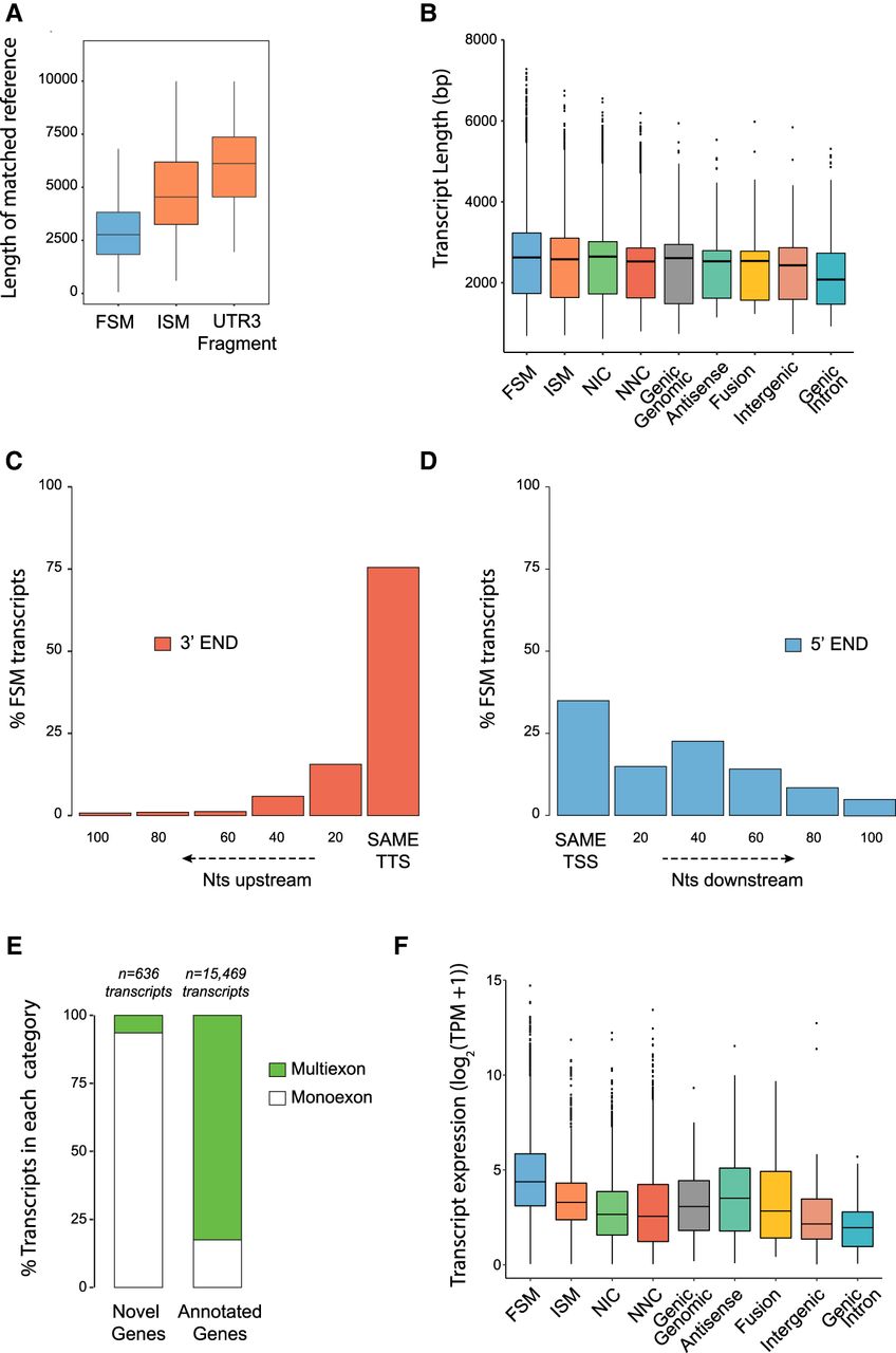 SQANTI characterization of the corrected PacBio transcriptome. (A) Length of the reference transcripts to which FSM, ISM, and UTR3 Fragment PacBio transcripts matched. (B) Length of PacBio transcripts by SQANTI categories. (C) Overlap at 3′ and (D) 5′ ends between the FSM transcripts and their respective matched reference transcripts. (TTS) transcription termination site, (TSS) transcription start site. (E) Percentage of monoexonic and multi-exonic transcripts for transcripts belonging to novel genes and annotated genes. (F) Transcript expression distribution across SQANTI categories.