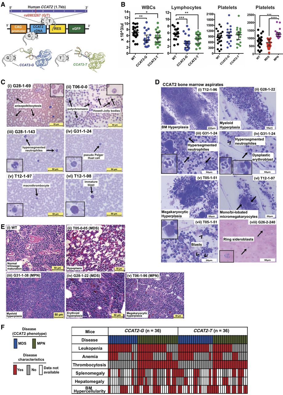CCAT2 mice display bone marrow insufficiency with clinical features of myeloid malignancies. (A) Schematic of CCAT2-plasmid cassette inserted into the mouse genome using pronuclear injection. A cartoon depicting the allele-specific secondary structure of 1.7-kb CCAT2 transcripts, which differ mostly at the ∼500 bp region surrounding the rs6983267(G/T) SNP, is shown at the bottom of panel A. (B) Peripheral blood counts of WT, CCAT2-G, and CCAT2-T mice. (C) Representative images of aberrant circulating peripheral blood cells in CCAT2-G and CCAT2-T mice. Arrows indicate the aberrations described. Images in the inset are 40× magnified aberrant cells. (D) Representative images of Hema III-stained aberrant cells present in bone marrow smears of CCAT2-G and CCAT2-T mice. Arrows and arrowheads indicate the aberrations described. Images in the inset are 40× magnified aberrant cells. (E) Histologic sections of bone marrow (from femur) with H&E staining; 40× magnified. Normal bone marrow from WT mice (i) in comparison with myeloid hyperplasic (ii), erythroid hyperplasic (iii), and megakaryocytic hyperplasic (iv) bone marrow from CCAT2-G and CCAT2-T mice. (F) The incidence of myelodysplastic and myeloproliferative clinicopathological characteristics in CCAT2-G and CCAT2-T mice are shown. Data are represented as median values ±95% confidence interval. (*) P < 0.05; (**) P < 0.01; (***) P < 0.001; (****) P < 0.0001.