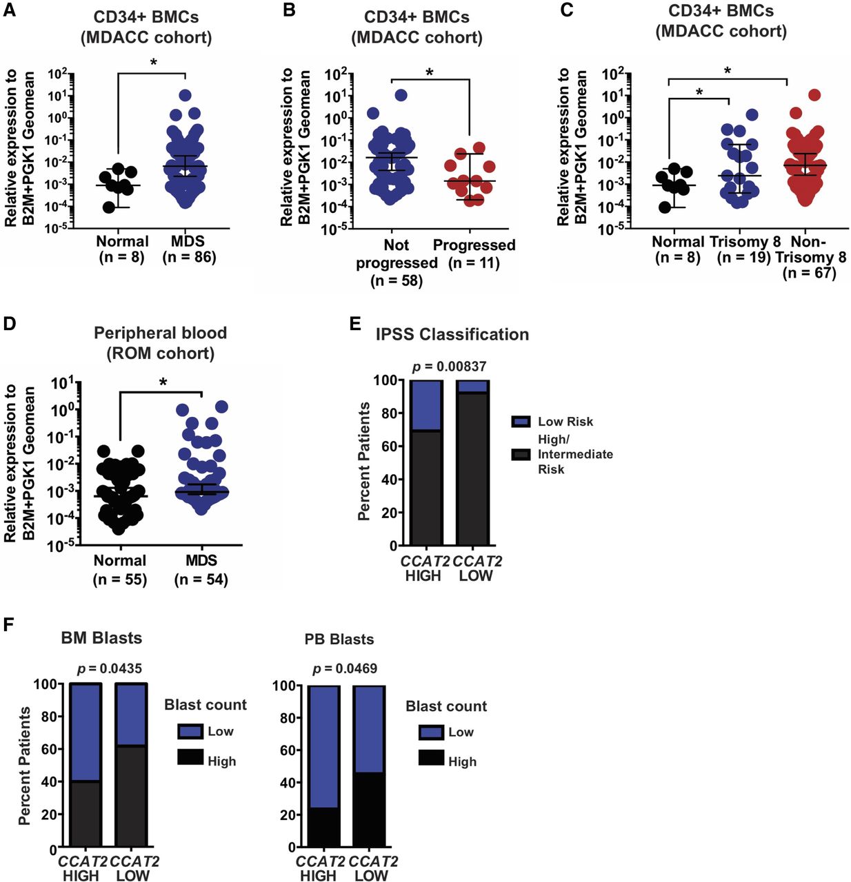 CCAT2 is overexpressed in MDS patients. (A,B) CCAT2 expression in CD34+ bone marrow cells of MDS patients and healthy individuals. (A) Comparison between healthy individuals and MDS patients. (B) Comparison between MDS patients who progressed and those who did not progress to secondary AML. (C) CCAT2 expression in CD34+ bone marrow cells of MDS patients with Trisomy 8, other genetic abnormalities, and healthy individuals. (D) CCAT2 expression in peripheral blood of MDS patients and healthy individuals. (E) Correlation between CCAT2 expression in MDS patients and their risk category (classified according to IPSS risk classification). (F) Correlation between CCAT2 expression and percent blasts in bone marrow and peripheral blood of MDS patients. Data are represented as median values ±95% confidence interval. (*) P < 0.05.