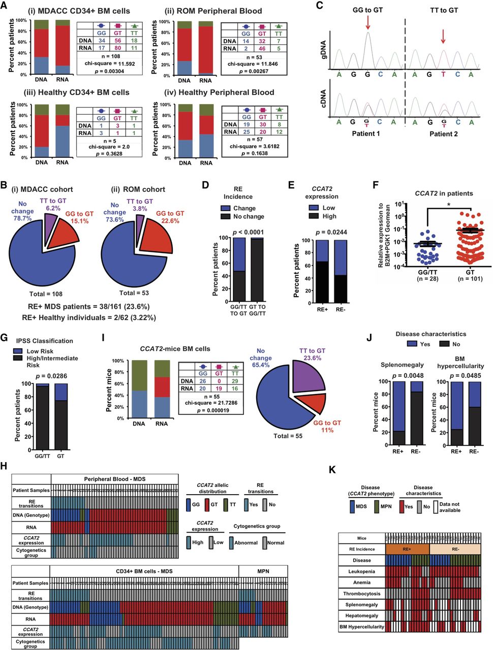 MDS patients display a novel non-APOBEC, non-ADAR, SNP-specific RNA editing at rs6983267 SNP. (A) Allelic imbalance between genomic DNA and CCAT2 cDNA at the SNP locus in CD34+ bone marrow cells (MDACC cohort) (i) or peripheral blood mononuclear cells (ROM cohort) of MDS patients (ii), and in CD34+ bone marrow cells (iii) or peripheral blood (iv) of healthy individuals. (B) Pie charts depicting the rate and types of rs6983267-RE observed in CD34+ bone marrow cells or peripheral blood mononuclear cells of MDS patients compared to healthy individuals. (C) Representative examples of two rs6983267-RE+ patients by Sanger sequencing of the genomic DNA and CCAT2 cDNA at the SNP locus. (D) Correlation between incidence of rs6983267-RE according to the genotype of MDS/MPN patients. (E) Correlation between CCAT2 expression levels and incidence of rs6983267-RE in MDS/MPN patients. (F) CCAT2 expression in patients that express CCAT2-GT compared to patients that express CCAT2-GG or CCAT2-TT. (G) Correlation between patients that express CCAT2-GT, CCAT2-GG, or CCAT2-TT and their risk category (classified according to IPSS risk classification). (H) CCAT2 expression levels, incidence of rs6983267-RE, and clinical features for each MDS/MPN patient analyzed are shown. (I,J) Rate of rs6983267-RE occurrence in the bone marrow cells of CCAT2 mice. (K) The incidence of rs6983267-RE and MDS/MPN clinicopathological characteristics displayed by CCAT2 mice are shown. Data are represented as mean values ± SEM. (*) P < 0.05.