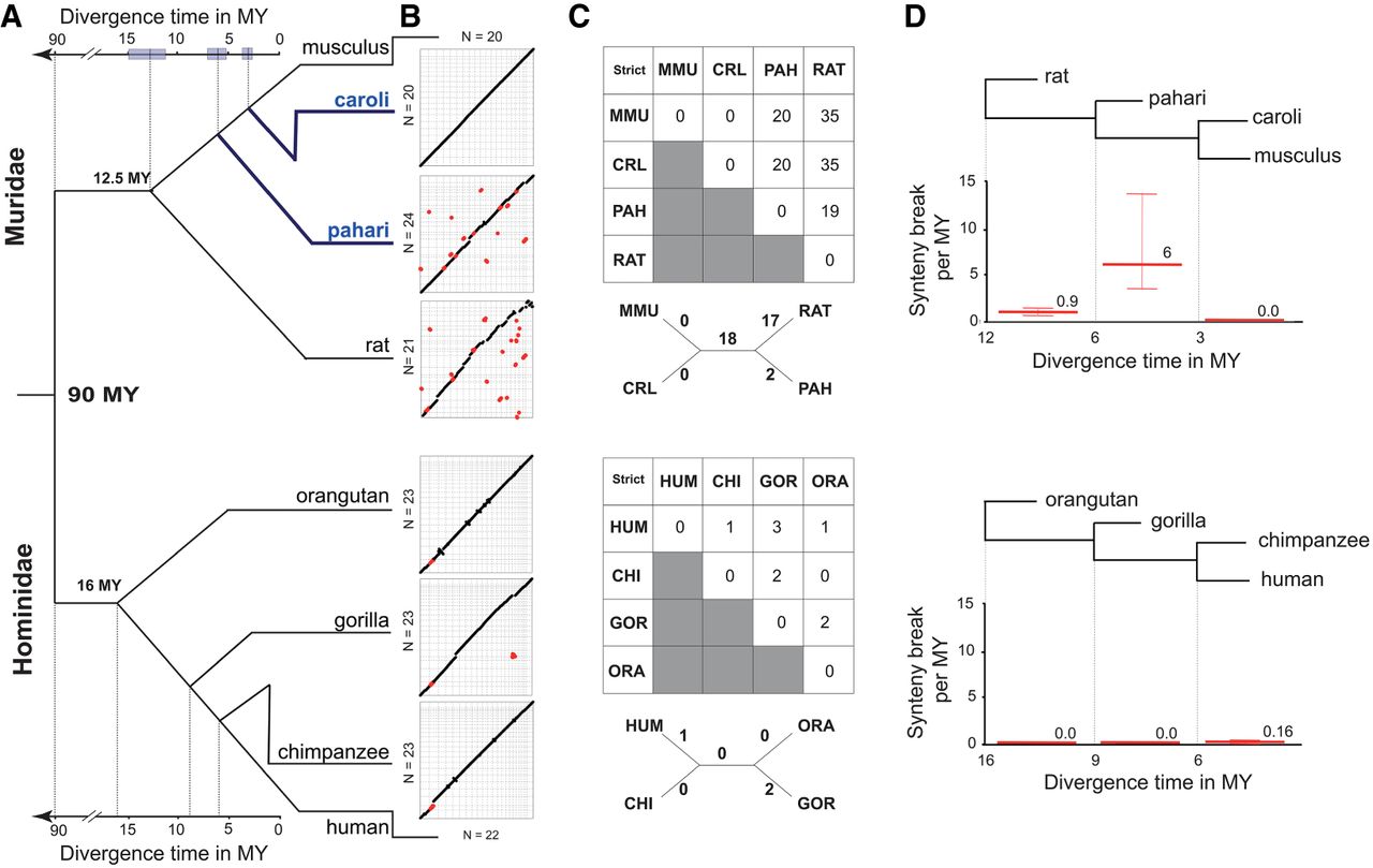 Muridae genomes undergo large chromosomal rearrangements in punctuate bursts, resulting in greater structural diversity than primates. (A) Phylogenetic tree showing that the divergence time of the four Muridae species mirrors that of the four Hominidae species. The Mus species in blue were sequenced and assembled for this study. The 95% confidence interval of the divergence time estimation is shown by the shaded boxes (Supplemental Methods SM1.16). (B) Dot plots of whole-genome pairwise comparison between Mus musculus and the three other Muridae (top), and between human and the three other Hominidae (bottom). The chromosomes of Mus musculus and human were ordered by chromosome number. The chromosomes of the other species were ordered to optimize the contiguity across the diagonal. Red dots represent large (>3 Mb) inter-chromosomal rearrangements (fusion/fission and translocation). (C) Matrix of neighbor-joining tree of synteny breaks involving inter-chromosomal rearrangement for Muridae and Hominidae: (MMU) Mus musculus; (CAR) Mus caroli; (PAH) Mus pahari; (RAT) rat; (HUM) Human; (CHI) chimpanzee; (GOR) gorilla; (ORA) orangutan. (D) The rate of synteny breaks between sequential internal branch points of the Muridae and Hominidae clades. Muridae have undergone a punctuate increase in the rate of syntenic breaks between 3 and 6 MYA.