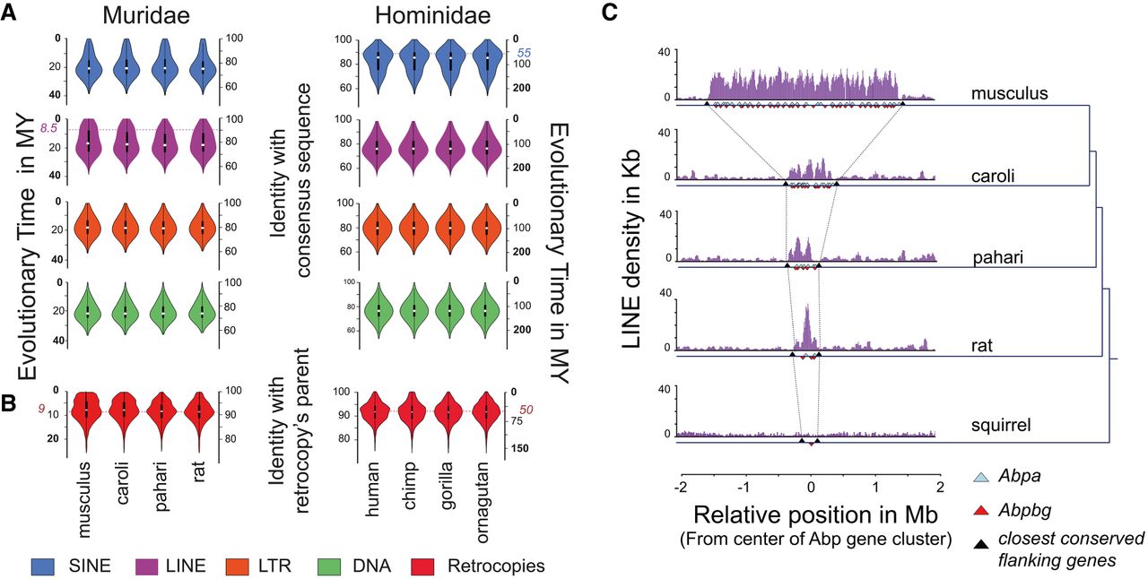 Recent LINE activity can remodel protein-coding gene loci. (A) Violin plots showing the distribution of repeat elements that have the indicated divergence from the ancestral element sequence: (blue) SINE; (purple) LINE; (orange) LTR; (green) DNA. The age of the transposable elements was estimated using the nucleotide divergence from ancestral SINE, LINE, LTR, and DNA elements (Supplemental Methods SM4.1). The dashed lines indicate the estimated peaks of the most recent expansions in Mus musculus and human. (B) Violin plots showing the distribution of retrocopies (red) that have the indicated divergence from their parental genes for each Muridae (left) and Hominidae (right) species. The age of the retrocopies was estimated by the nucleotide divergence from ancestral retrocopies and the corresponding parental genes (Supplemental Methods SM4.3). The dashed line indicates the peak of the most recent expansion in Mus musculus. (C) Representation of the density of LINE elements in the Abp gene cluster for Mus musculus, Mus caroli, Mus pahari, the rat, and the thirteen-lined ground squirrel. The blue and red triangles represent the Abp genes: (blue) Abpa (Scgb1b); (red) Abpbg (Scgb2b). The black triangles represent the closest flanking genes (upstream [Scn1b] and downstream [Gpi1]) shared by the four Muridae species and the squirrel.