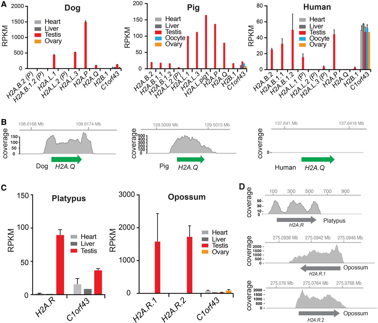 Expression of short histone variants. (A) Analyses of short H2A expression using public RNA-seq data from selected tissues of dog, pig, and human. Error bars show standard deviation of biological replicates, where available. Expression of the germ cell–specific H2B.1 variant and a housekeeping gene C1orf43 (Eisenberg and Levanon 2013) are shown for comparison (more controls are shown in Supplemental Fig. S3). Mapped reads are shown in reads per kilobase per million mapped (RPKM). (B) RNA-seq coverage over the H2A.Q locus in dog, pig, and human. Coordinates along the assembled X Chromosome are indicated at the top. (C) RNA-seq analyses of platypus and opossum H2A.Rs, and one housekeeping gene (as in A), across somatic and reproductive tissues. Error bars as in A. (D) RNA-seq coverage as in B. Coordinates along the annotated contig or chromosome (Chr 6 for opossum H2A.Rs and contig111576 for platypus) are shown at the top.