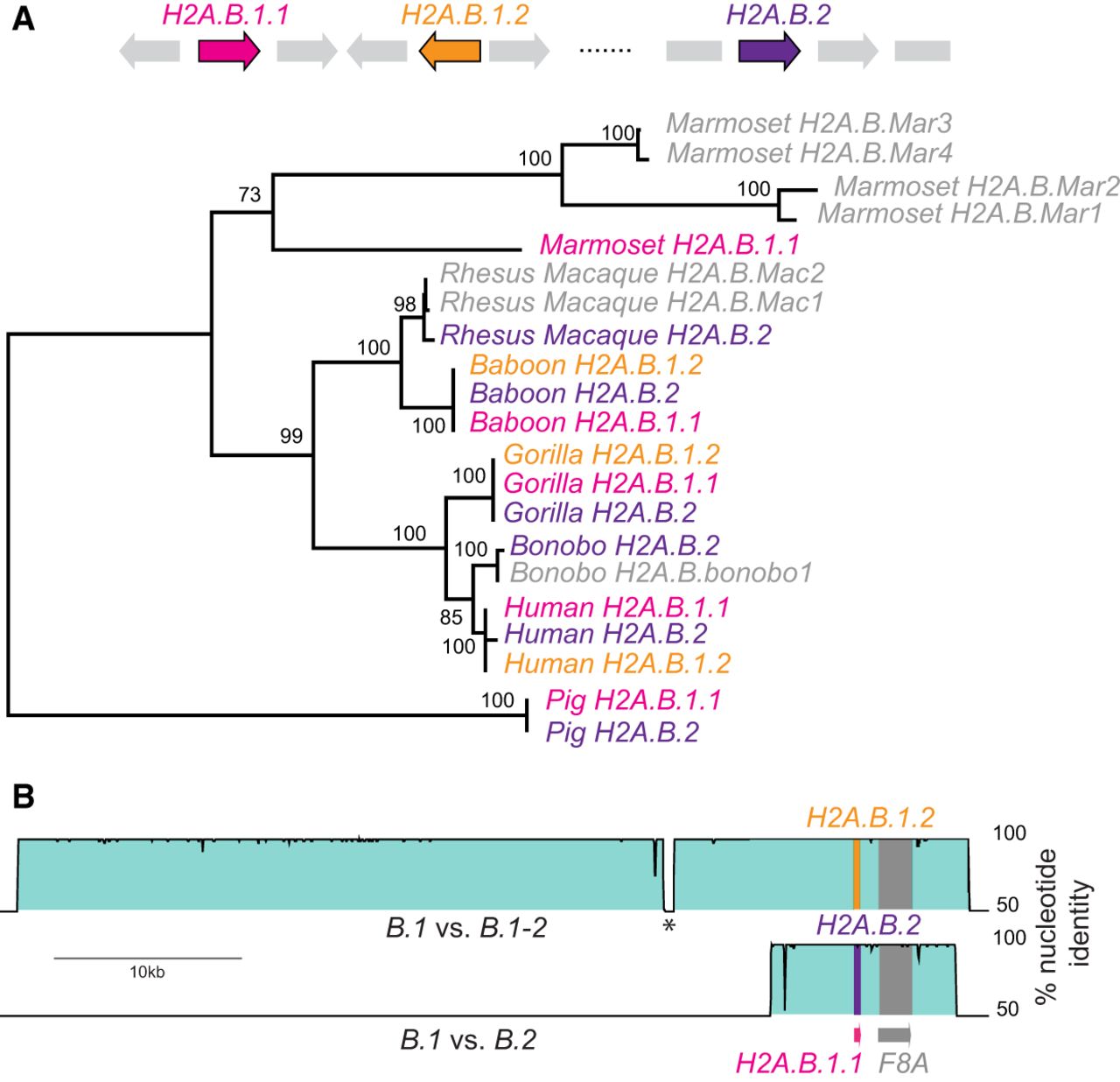 Concerted evolution by gene conversion among primate H2A.B genes. (A) Maximum-likelihood nucleotide phylogeny of representative primate H2A.B genes rooted using pig as an outgroup. Bootstrap values are shown for nodes with >50% support. A cartoon shows the loci containing ancestral duplications H2A.B.1.1 (pink), H2A.B.1.2 (orange), and H2A.B.2 (purple), and gene names are colored accordingly in the tree. We also include some genes that are either in nonsyntenic loci (representing additional duplicates) or were on short scaffolds so could not be assigned to a locus (four from marmoset, two from rhesus macaque, and one from bonobo, denoted .Mar1 to .Mar4; .Mac1, .Mac2; and .bonobo1, respectively). (B) VISTA plots showing very high nucleotide identity across large genomic regions flanking the three human H2A.B genes (proximal to F8A), comparing H2A.B.1.1 genomic sequence as a reference to H2A.B.1.2 (upper plot) and H2A.B.2 (lower plot). An interruption in high identity (asterisk) is due to a recent transposon insertion.