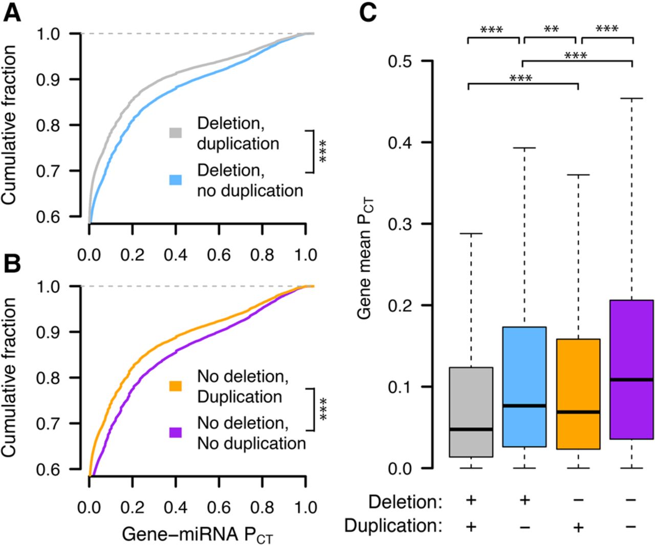 Conserved miRNA targeting of autosomal genes stratified by copy number variation in 59,898 human exomes. Probabilities of conserved targeting (PCT) of all gene–miRNA interactions involving nonduplicated and duplicated genes, further stratified as (A) deleted (gray, n = 69,339 interactions from 4118 genes; blue, n = 80,290 interactions from 3976 genes) or (B) not deleted (orange, n = 51,514 interactions from 2916 genes; purple, n = 72,826 interactions from 3510 genes). (***) P < 0.001, two-sided Kolmogorov–Smirnov test. (C) Mean gene-level PCT scores. (**) P < 0.01, (***) P < 0.001, two-sided Wilcoxon rank-sum test.