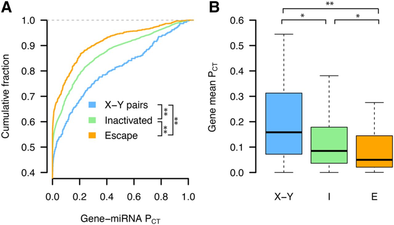 X-Y pairs and X-inactivated genes have higher miRNA conservation scores than X escape genes. PCT score distributions of all gene–miRNA interactions involving (A) human X-Y pairs (n = 371 interactions from 15 genes), X-inactivated genes (n = 6743 interactions from 329 genes), and X escape genes (n = 1037 interactions from 56 genes). (**) P < 0.01, two-sided Kolmogorov–Smirnov test. (B) Mean gene-level PCT scores. (*) P < 0.05, (**) P < 0.01, two-sided Wilcoxon rank-sum test.