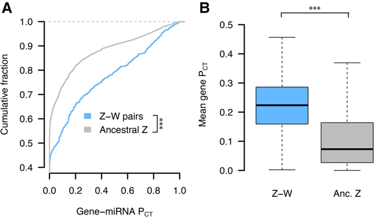Z-W pairs have higher miRNA conservation scores than other ancestral Z-linked genes. (A) PCT score distributions of all gene–miRNA interactions involving the human orthologs of chicken Z-W pairs (n = 832 interactions from 28 genes) and other ancestral Z genes (n = 16,692 interactions from 657 genes). (***) P < 0.001, two-sided Kolmogorov–Smirnov test. (B) Mean gene-level PCT scores. (***) P < 0.001, two-sided Wilcoxon rank-sum test.