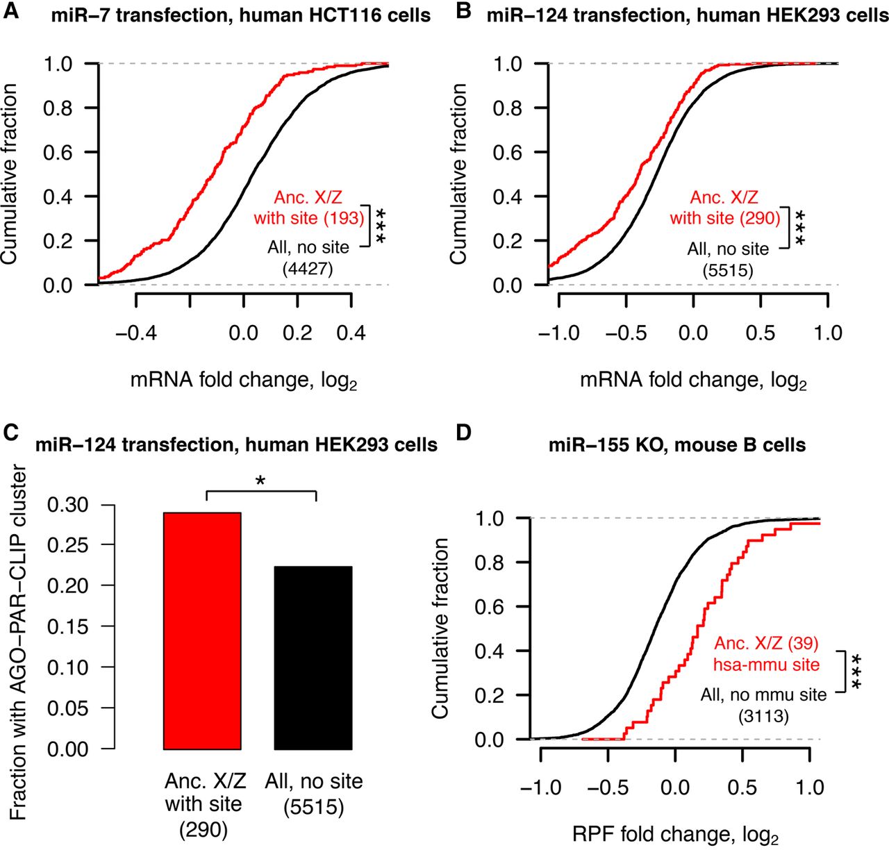 Analyses of experimental data sets validate miRNA target site function. Responses to transfection (A–C) or knockout (D) of indicated miRNAs in human (A–C) or mouse (D) cell types. Each panel depicts corresponding changes in mRNA levels (A,B), in fraction of Argonaute-bound genes (C), and in mRNA stability and translational efficiency as measured by ribosome protected fragments (RPF; D). In each case, X-linked genes and the human orthologs of Z-linked genes containing target sites with an assigned PCT score (red) for the indicated miRNA were compared with all expressed genes lacking target sites (black); gene numbers are indicated in parentheses. (A,B,D) (***) P < 0.001, two-sided Kolmogorov–Smirnov test. (C) (*) P < 0.05, two-sided Fisher's exact test.
