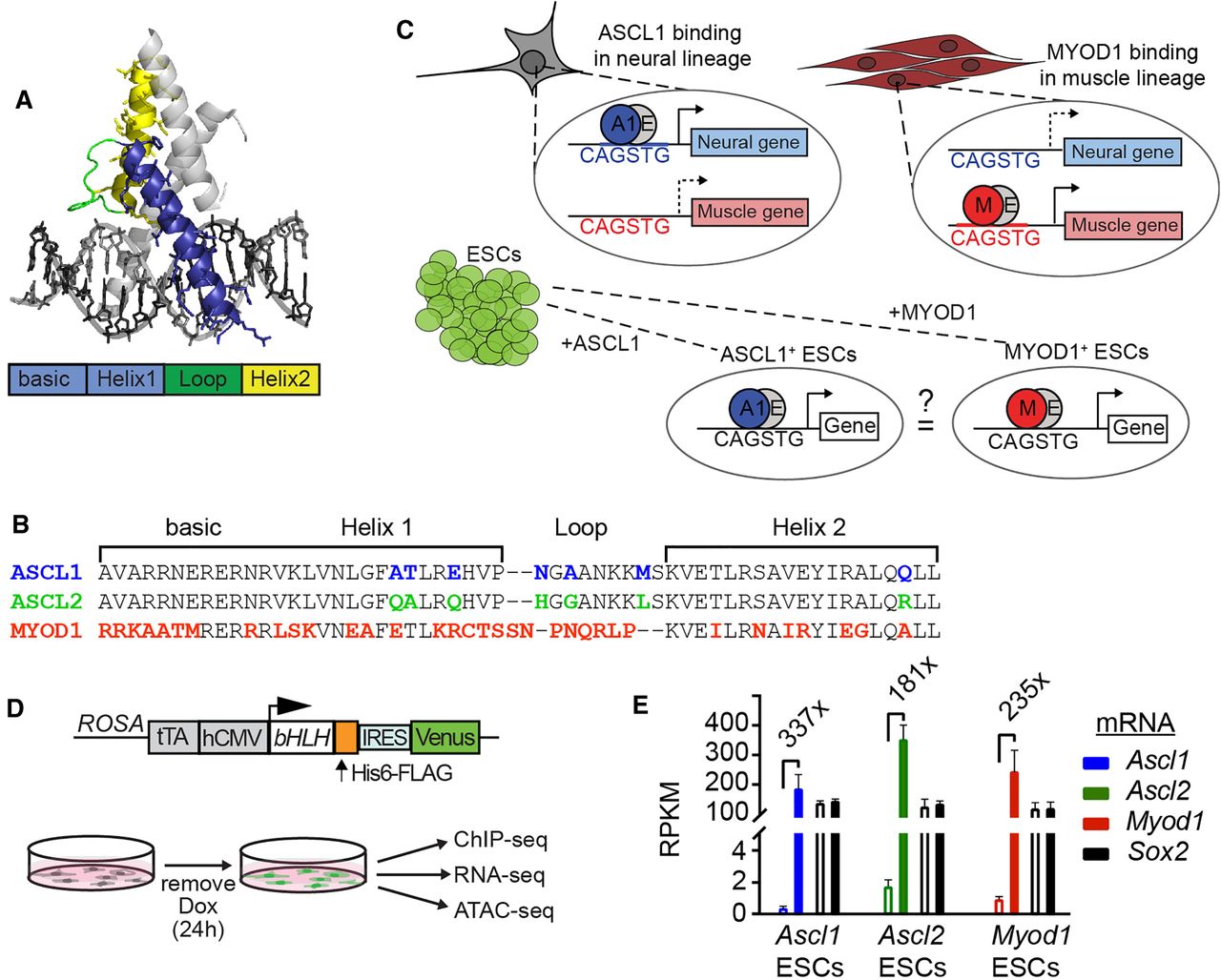 ASCL1, ASCL2, and MYOD1 are related class II bHLH transcription factors. Class II bHLH factors heterodimerize with class I bHLH factors and selectively bind CANNTG Eboxes in vitro (Johnson et al. 1992; Murre et al. 1994). (A) Illustration showing conserved basic helix-loop-helix structural domains modeled on the NEUROD1:E47 crystal structure (Longo et al. 2008). Colored bar shows defined domains and corresponds to the colors on the structure. (B) Comparison of the amino acid sequence of ASCL1, ASCL2, and MYOD1 bHLH domains. The colors represent distinctions within the bHLH domain unique to only one of the proteins compared. (C) Illustration showing the concept tested in this study. Previous work shows that ASCL1 and MYOD1 bind to distinct sites in the lineages where they are expressed, neural and muscle, respectively; however, they recognize the same CAGSTG motif. We ask whether they will bind the same sites or distinct sites when presented with the same chromatin landscape. (D) Diagram of the transgene present in the ESC lines that express a single bHLH factor when cultured in the absence of doxycycline (DOX) (Gossen and Bujard 1992; Guturu et al. 2013). (E) RNA-seq RPKM values from ESCs before and after induction of the individual bHLH factors (Supplemental Table S2). The mean fold change across replicates is shown for each. mRNA levels for an endogenous TF in ESCs, Sox2, are shown for comparison.