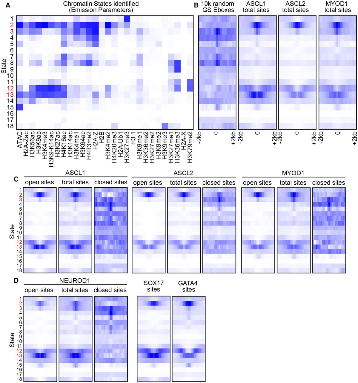 ASCL1, ASCL2, and MYOD1 bind similar chromatin states enriched with active features. (A) Chromatin states (Ernst and Kellis 2012) identified by hidden Markov modeling of chromatin features identified by ChIP-seq and ATAC-seq in ESCs from published data sets and data generated in this study. The strength of the state association with each chromatin feature (columns) is indicated by increasing color intensity. States indicated in red represent those highlighted in text. (B–D) State enrichment diagrams of genomic sites identified by random CAGSTG Ebox sites and ASCL1, ASCL2, and MYOD1 ChIP-seq (B), by bHLH ChIP-seq binned into those sites in open versus closed chromatin from Figure 4A (C), and by additional TF binding sites for comparison (D). Each plot represents the degree of association of the sites (color intensity) versus the states indicated in A in the 4-kb interval centered on the ChIP-seq peak apex. See Methods for a list of GEO accession numbers for all data sets used.