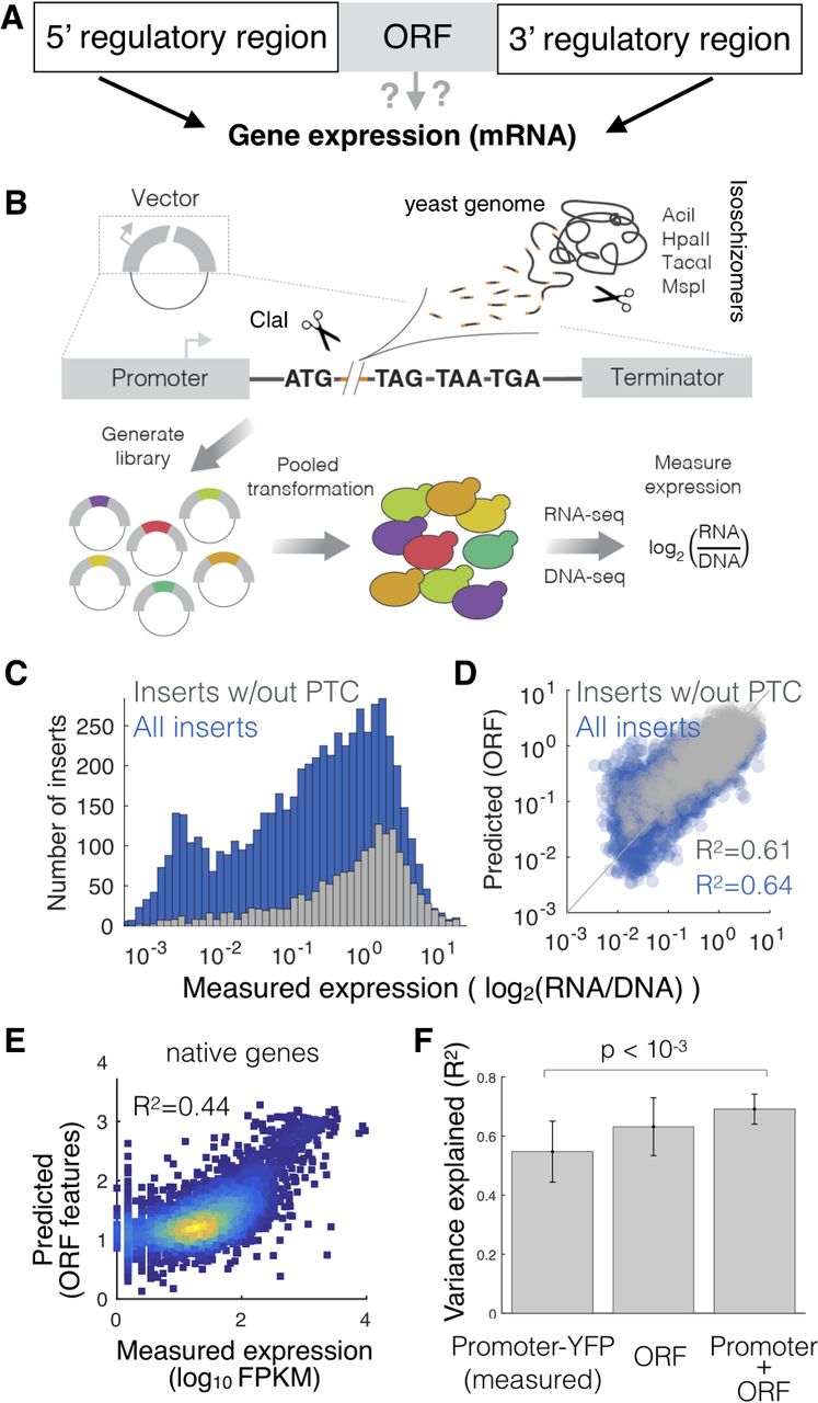 An expression library of genomic fragments to quantify the ability of ORF-encoded sequence features to regulate gene expression. (A) A schematic view of the following initial question: Does the ORF determine gene expression? (B) Scheme of the gDNA library preparation and expression measurements. (C) Measured expression distributions for all inserts (blue) and only those lacking a premature termination codon (PTC; gray). (D) Measured versus predicted expression levels in the gDNA library. Expression is predicted from the sequence of each gDNA insert using a 10-fold cross-validated linear model (R2 is calculated across all test data from all cross-validations). (E) Expression predicted from the sequence of each native yeast ORF using the same features as for the gDNA library. (F) Including ORF-encoded features in a model of expression increases the ability of promoter-YFP data to predict steady-state mRNA levels. Error bars, SD from 10-fold cross-validation.
